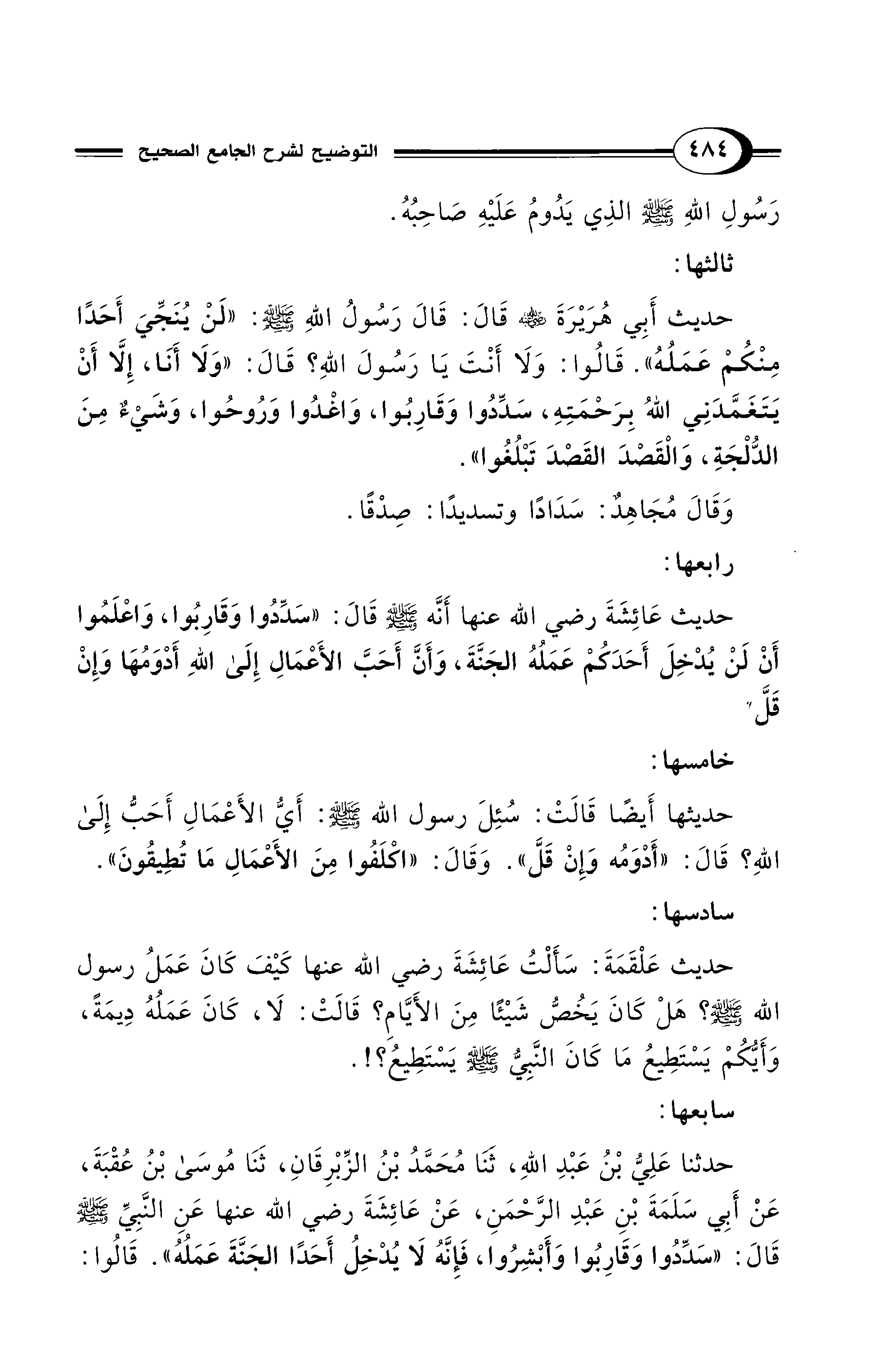حديث عَائِشَةَ - رضي الله عنها - أَنَّه - صلى الله عليه وسلم - قَالَ: "سَدِّدُوا وَقَارِبُوا، وَاعْلَمُوا أَنْ لَنْ يُدْخِلَ أَحَدَكُمْ عَمَلُهُ الجَنَّةَ، وَأَنَّ أَحَبَّ الأَعْمَالِ إِلَى اللهِ أَدْوَمُهَا وَإِنْ قَلَّ.