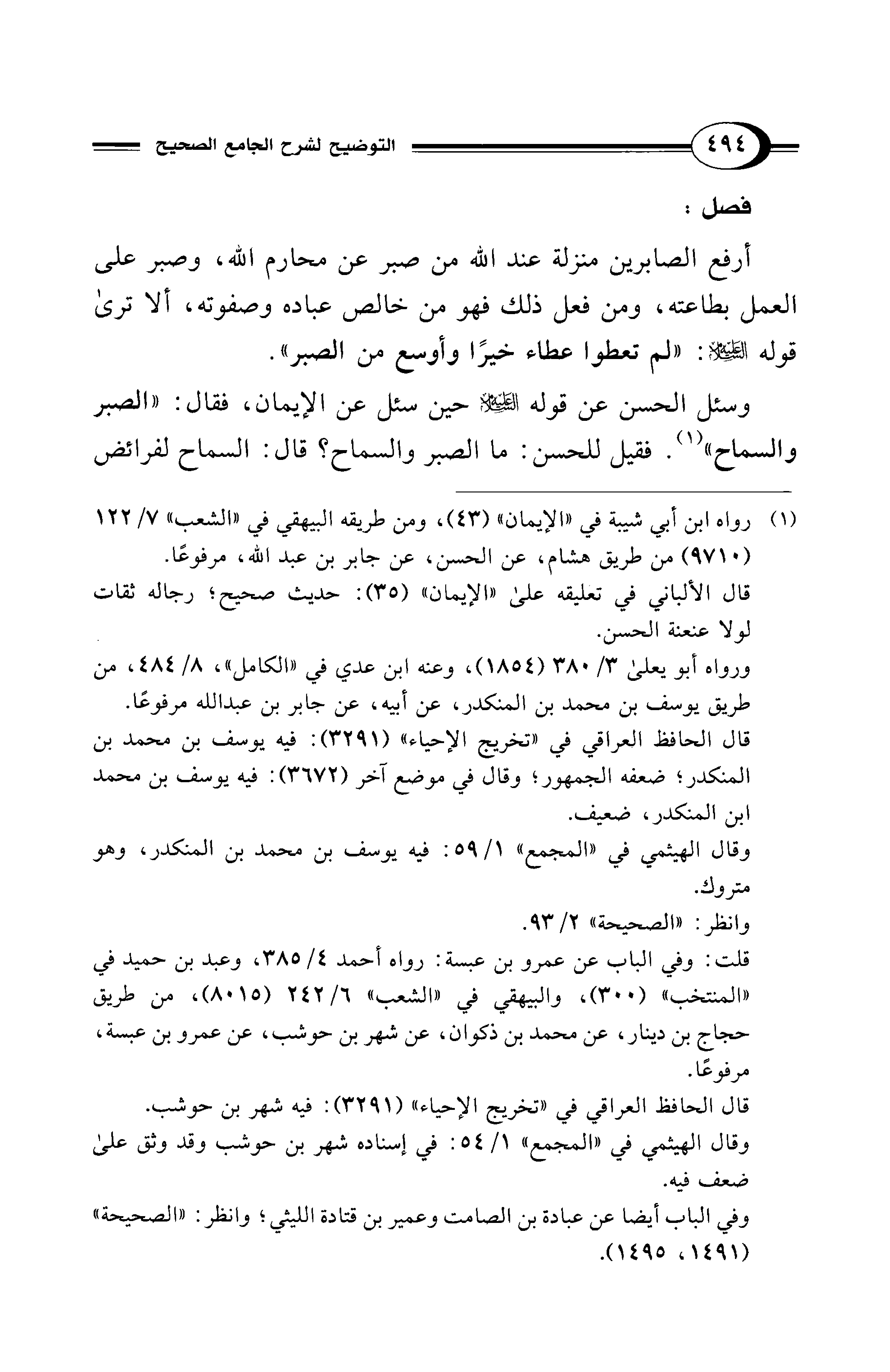 وسئل الحسن عن قوله - عليه السلام - حين سئل عن الإيمان، فقال: "الصبر والسماح" (¬1). فقيل للحسن: ما الصبر والسماح؟ قال: السماح لفرائض