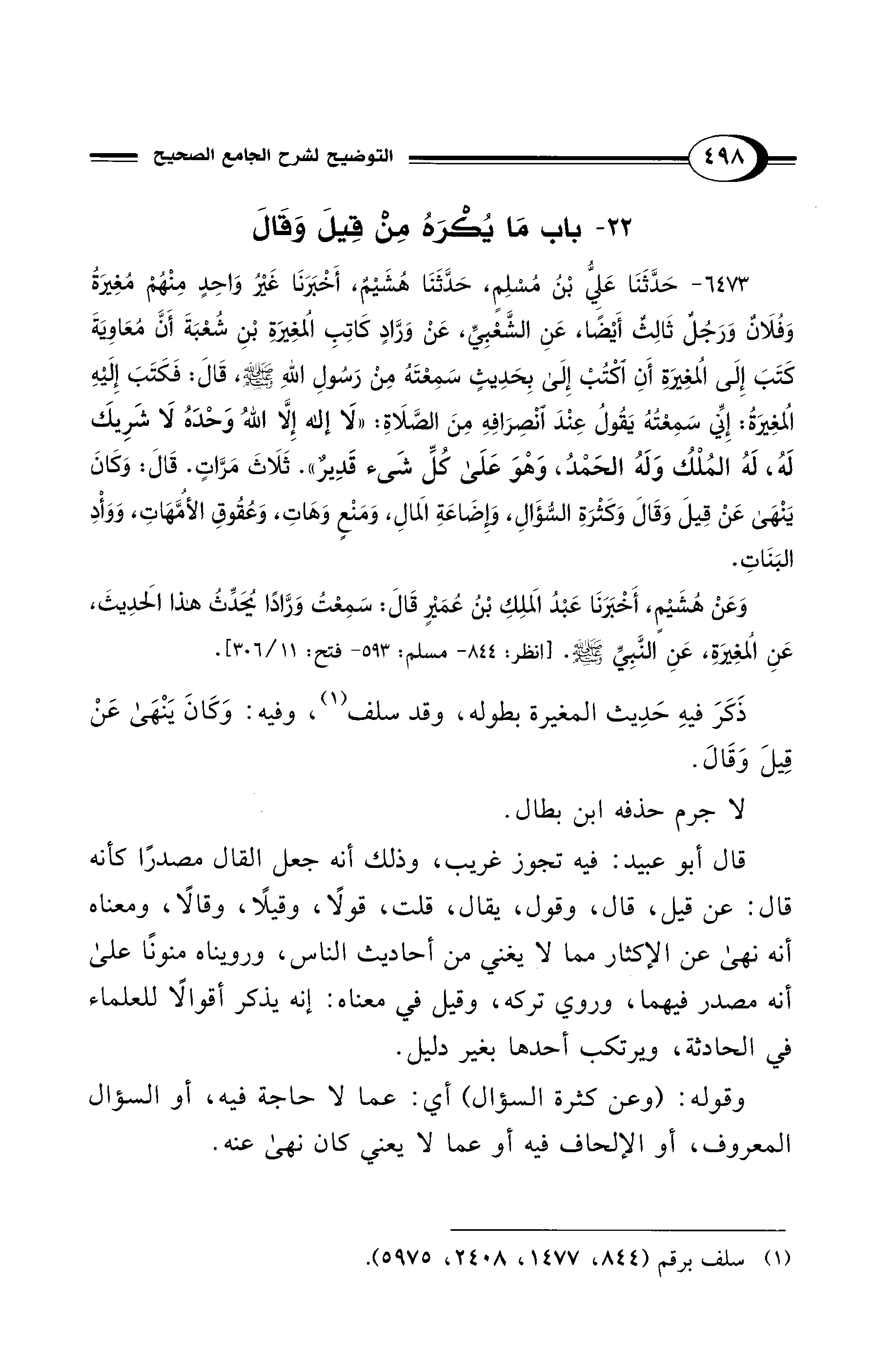 6473 - حَدَّثَنَا عَلِيُّ بْنُ مُسْلِمٍ، حَدَّثَنَا هُشَيْمٌ، أَخْبَرَنَا غَيْرُ وَاحِدٍ مِنْهُمْ مُغِيرَةُ وَفُلاَنٌ وَرَجُلٌ ثَالِثٌ أَيْضًا، عَنِ الشَّعْبِيِّ، عَنْ وَرَّادٍ كَاتِبِ الْمُغِيرَةِ بْنِ شُعْبَةَ أَنَّ مُعَاوِيَةَ كَتَبَ إِلَى الْمُغِيرَةِ أَنِ اكْتُبْ إِلَيَّ بِحَدِيثٍ سَمِعْتَهُ مِنْ رَسُولِ اللهِ - صلى الله عليه وسلم -، قَالَ: فَكَتَبَ إِلَيْهِ الْمُغِيرَةُ: أَنِّي سَمِعْتُهُ يَقُولُ عِنْدَ انْصِرَافِهِ مِنَ الصَّلاَةِ: «لاَ إِلَهَ إِلاَّ اللهُ وَحْدَهُ لاَ شَرِيكَ لَهُ، لَهُ الْمُلْكُ وَلَهُ الْحَمْدُ، وَهْوَ عَلَى كُلِّ شَيْءٍ قَدِيرٌ». ثَلاَثَ مَرَّاتٍ. قَالَ: وَكَانَ يَنْهَى عَنْ قِيلَ وَقَالَ وَكَثْرَةِ السُّؤَالِ، وَإِضَاعَةِ الْمَالِ، وَمَنْعٍ وَهَاتِ، وَعُقُوقِ الأُمَّهَاتِ، وَوَأْدِ الْبَنَاتِ.