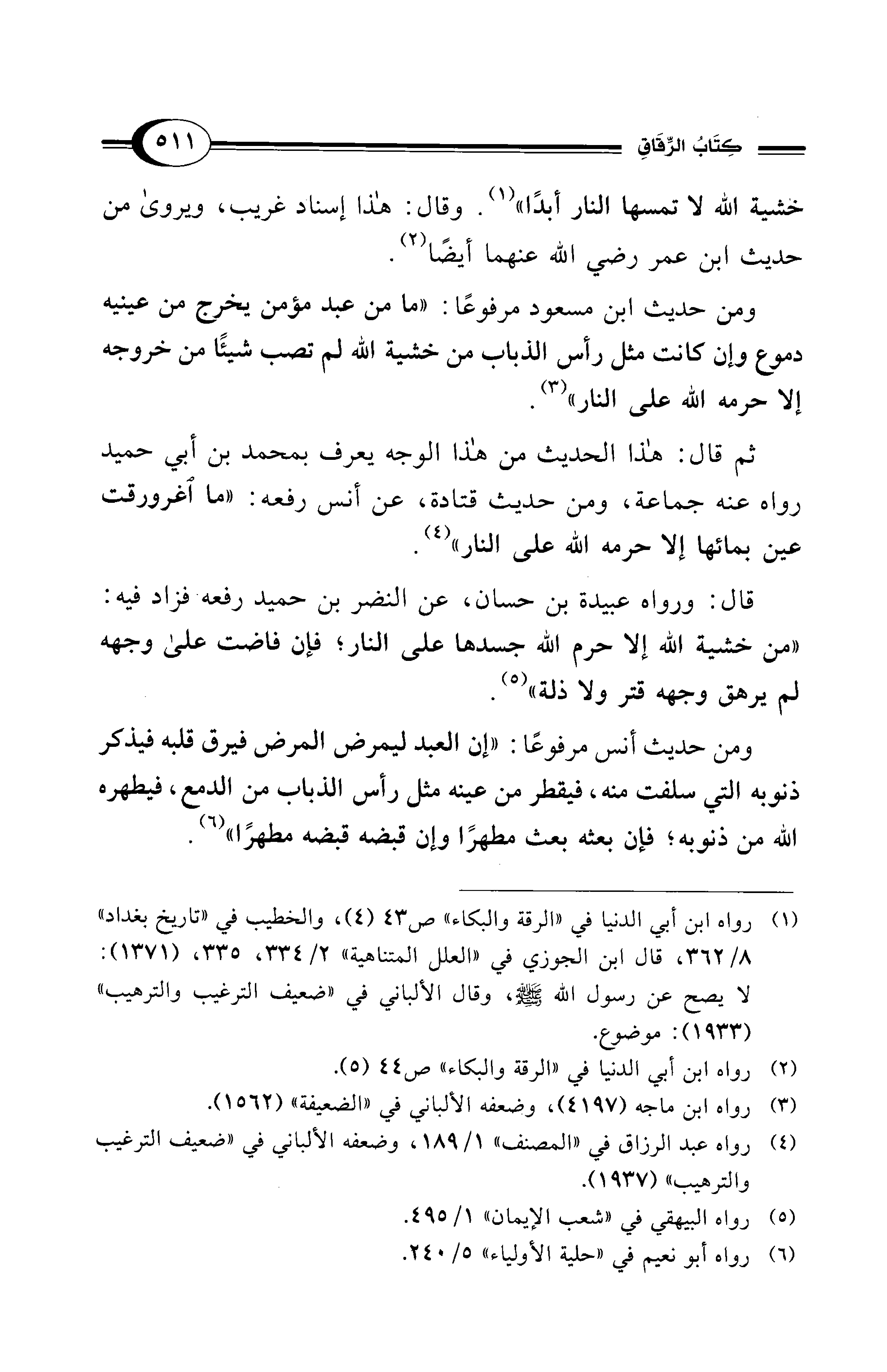 (¬1) رواه ابن أبي الدنيا في "الرقة والبكاء" ص 43 (4)، والخطيب في "تاريخ بغداد" 8/ 362، قال ابن الجوزي في "العلل المتناهية" 2/ 334، 335، (1371): لا يصح عن رسول الله - صلى الله عليه وسلم -، وقال الألباني في "ضعيف الترغيب والترهيب" (1933): موضوع.