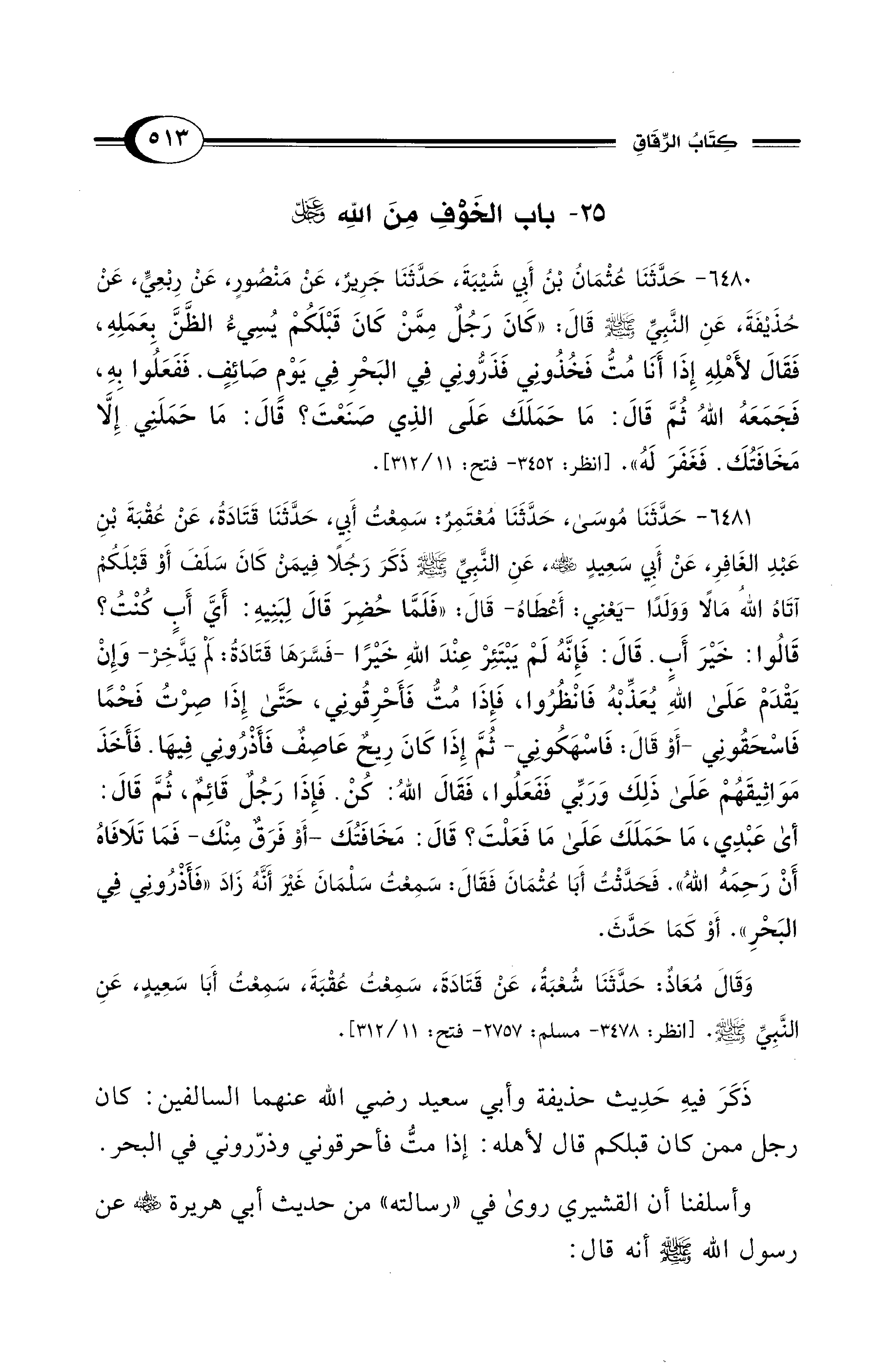 6480 - حَدَّثَنَا عُثْمَانُ بْنُ أَبِي شَيْبَةَ، حَدَّثَنَا جَرِيرٌ، عَنْ مَنْصُورٍ، عَنْ رِبْعِيٍّ، عَنْ حُذَيْفَةَ، عَنِ النَّبِيِّ - صلى الله عليه وسلم - قَالَ: «كَانَ رَجُلٌ مِمَّنْ كَانَ قَبْلَكُمْ يُسِيءُ الظَّنَّ بِعَمَلِهِ، فَقَالَ لأَهْلِهِ إِذَا أَنَا مُتُّ فَخُذُونِي فَذَرُّونِي فِي الْبَحْرِ فِي يَوْمٍ صَائِفٍ، فَفَعَلُوا بِهِ، فَجَمَعَهُ اللهُ ثُمَّ قَالَ: مَا حَمَلَكَ عَلَى الَّذِي صَنَعْتَ؟ قَالَ: مَا حَمَلَنِي إِلاَّ مَخَافَتُكَ. فَغَفَرَ لَهُ». [انظر: 3452 - فتح: 11/ 312].