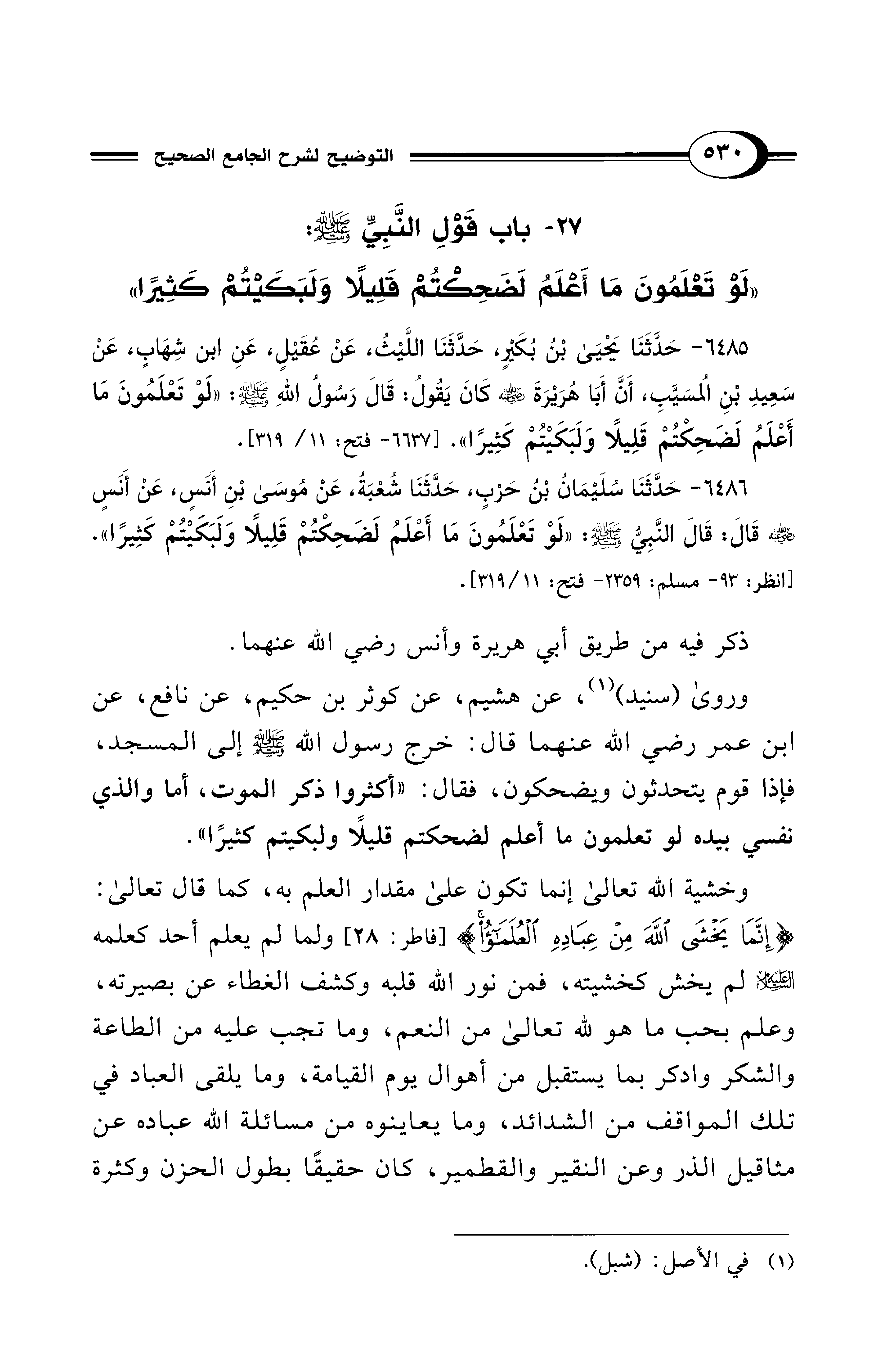 27 - باب قَوْلِ النَّبِيِّ - صلى الله عليه وسلم -: «لَوْ تَعْلَمُونَ مَا أَعْلَمُ لَضَحِكْتُمْ قَلِيلاً وَلَبَكَيْتُمْ كَثِيرًا»