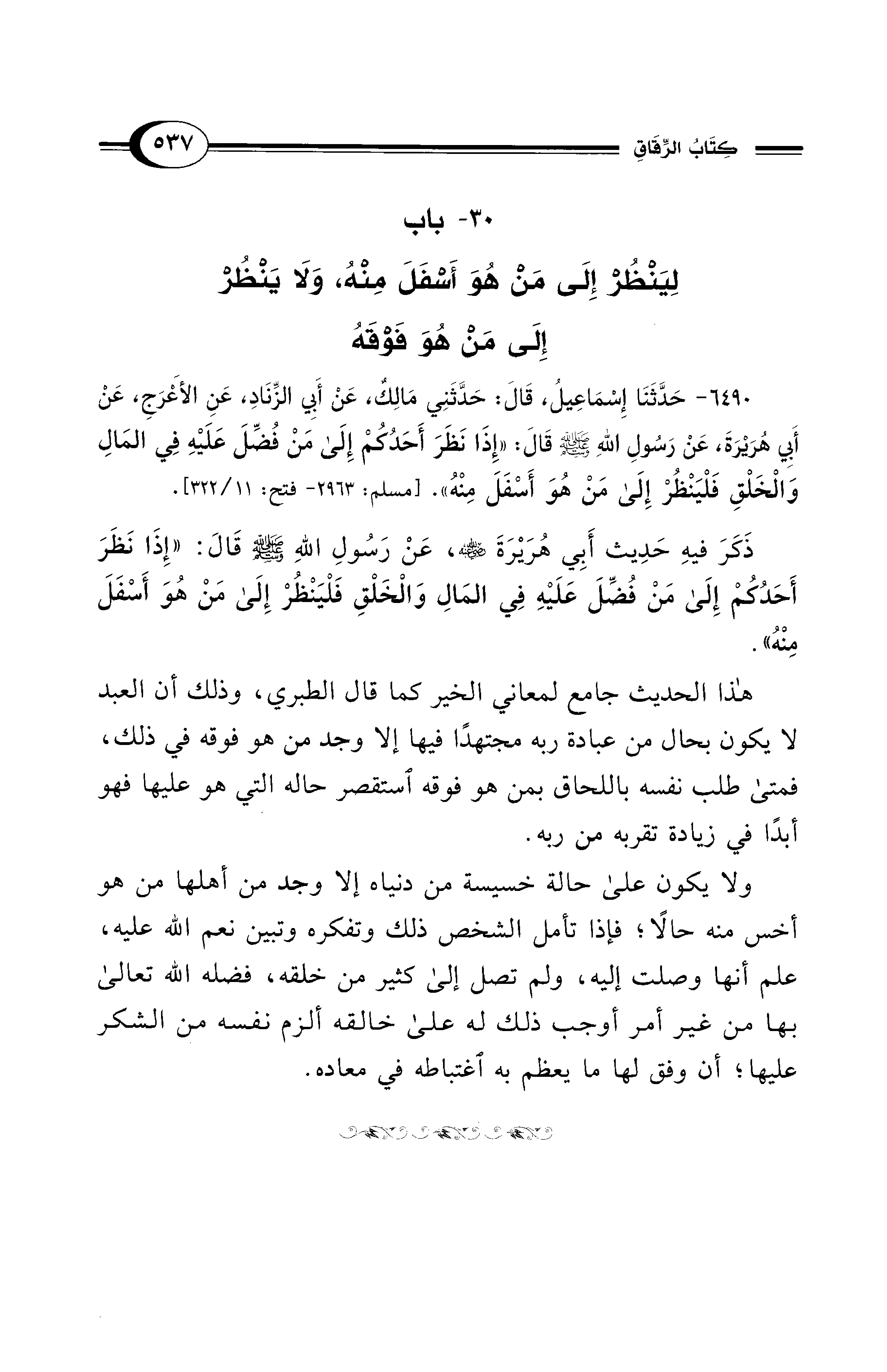 ذَكَرَ فيهِ حَدِيث أَبِي هُرَيْرَةَ - رضي الله عنه -، عَنْ رَسُولِ اللهِ - صلى الله عليه وسلم - قَالَ: "إِذَا نَظَرَ أَحَدُكُمْ إِلَى مَنْ فُضِّلَ عَلَيْهِ فِي المَالِ وَالْخَلْقِ فَلْيَنْظُرْ إِلَى مَنْ هُوَ أَسْفَلَ مِنْهُ".