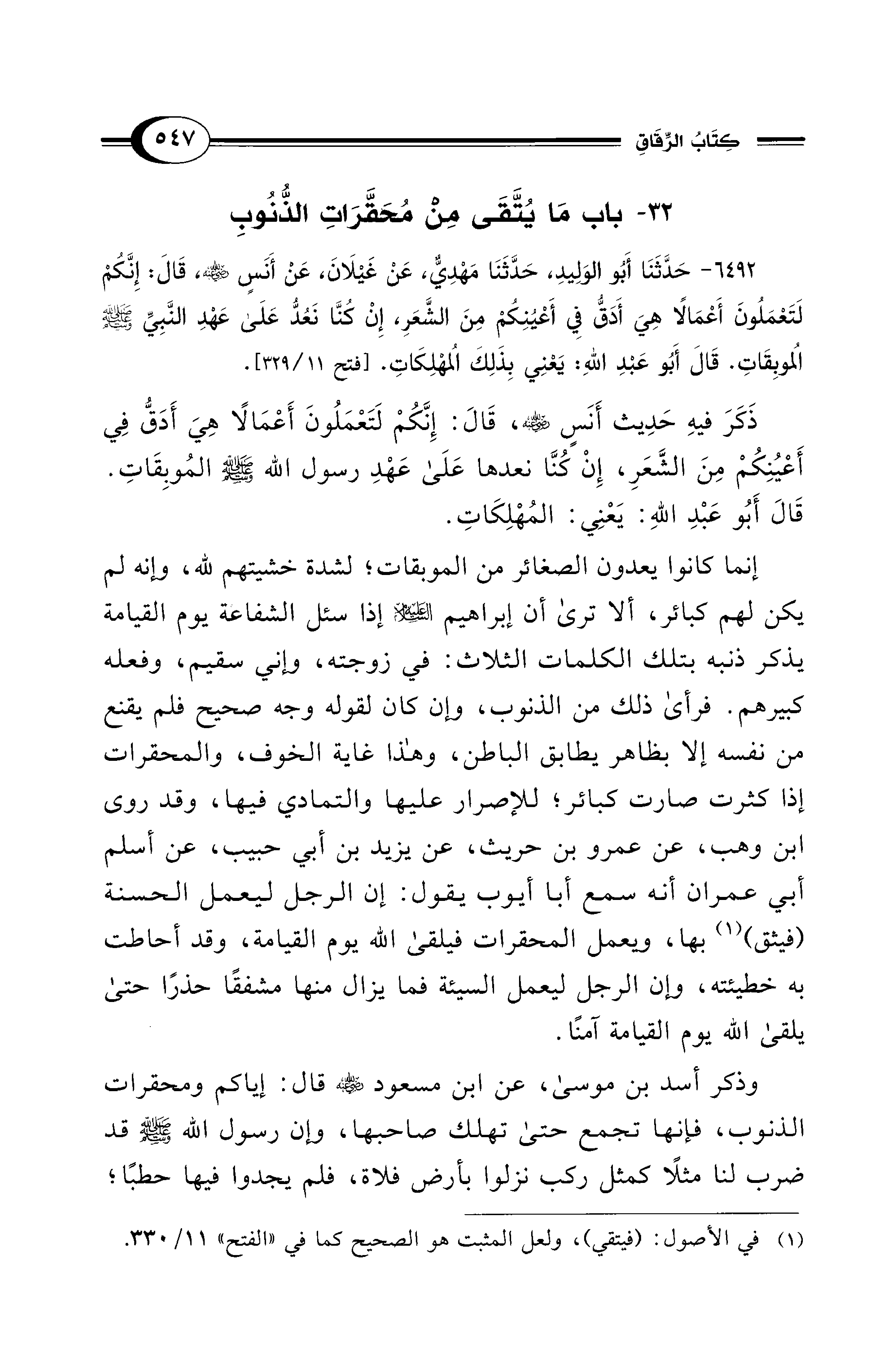 ذَكَرَ فِيهِ حَدِيث أَنَسٍ - رضي الله عنه -، قَالَ: إِنَّكُمْ لَتَعْمَلُونَ أَعْمَالًا هِيَ أَدَقُّ فِي أَعْيُنِكُمْ مِنَ الشَّعَرِ، إِنْ كُنَّا نعدها عَلَى عَهْدِ رسول الله - صلى الله عليه وسلم - المُوبِقَاتِ. قَالَ أَبُو عَبْدِ اللهِ: يَعْنِي: المُهْلِكَاتِ.