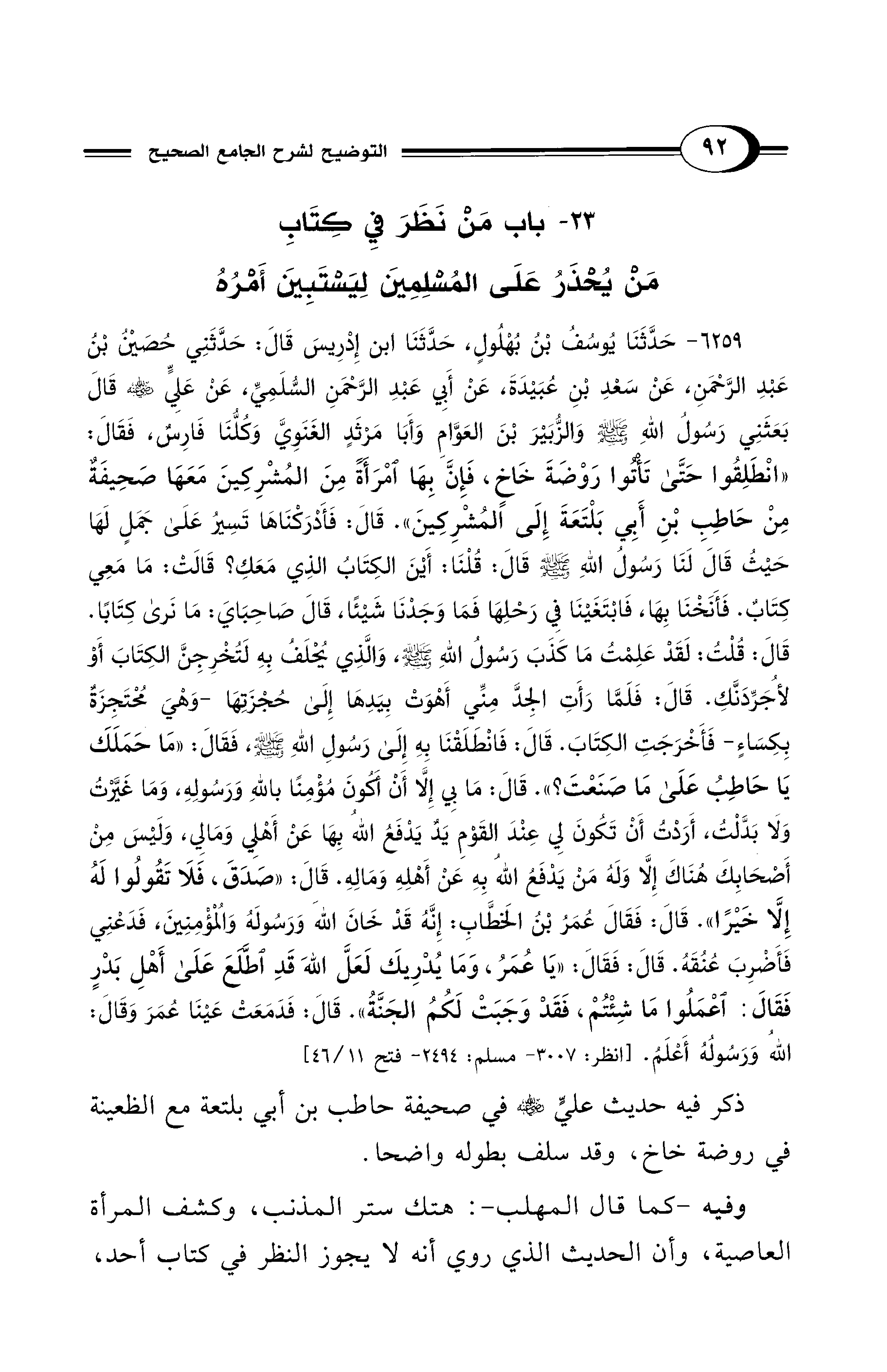 23 - باب مَنْ نَظَرَ فِي كِتَابِ مَنْ يُحْذَرُ عَلَى الْمُسْلِمِينَ لِيَسْتَبِينَ أَمْرُهُ