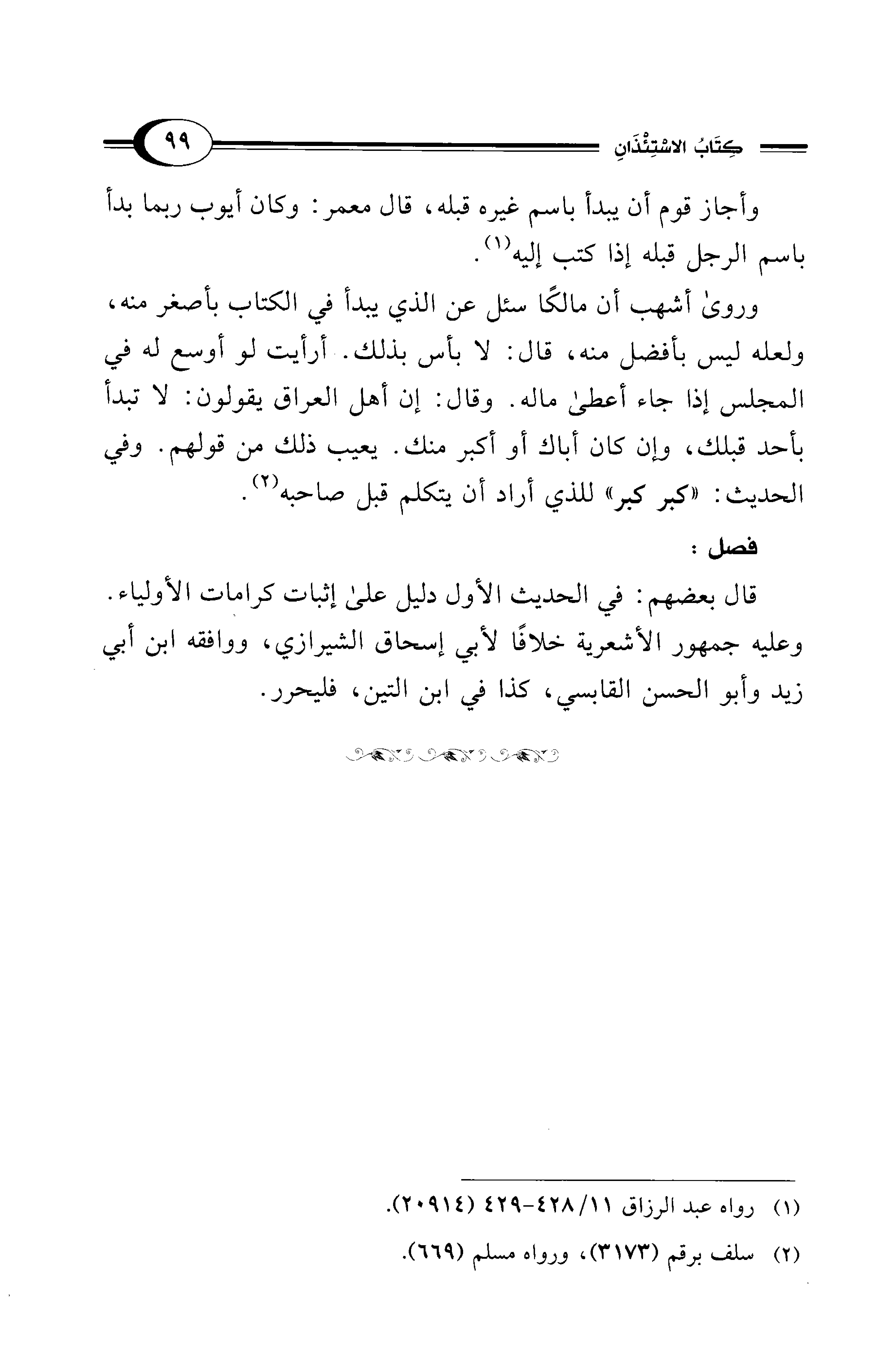 وروى أشهب أن مالكًا سئل عن الذي يبدأ في الكتاب بأصغر منه، ولعله ليس بأفضل منه، قال: لا بأس بذلك. أرأيت لو أوسع له في المجلس إذا جاء أعطى ماله. وقال: إن أهل العراق يقولون: لا تبدأ بأحد قبلك، وإن كان أباك أو أكبر منك. يعيب ذلك من قولهم. وفي الحديث: "كبر كبر" للذي أراد أن يتكلم قبل صاحبه (¬2).