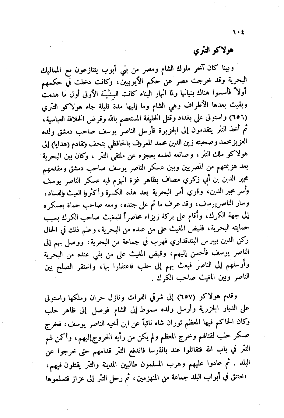 وبينا كان آخر ملوك الشام ومصر من بني أيوب يتنازعون مع المماليك البحرية وقد خرجت مصر عن حكم الأيوبيين، وكانت دخلت في حكمهم أولاً فأسسوا هناك بنيانها ولما انهار البناء كانت البِنْيَة الأولى أول ما هدمت وبقيت بعدها الأطراف وهي الشام وما إليها مدة قليلة جاء هولاكو التتري 656 واستولى على بغداد وقتل الخليفة المستعصم بالله وقرض الخلافة العباسية، ثم أخذ التتر يتقدمون إلى الجزيرة فأرسل الناصر يوسف صاحب دمشق ولده العزيز محمد وصحبته زين الدين محمد المعروف بالحافظي بتحف وتقادم هدايا إلى هولاكو ملك التتر، وصانعه لعلمه بعجزه عن ملتقى التتر، وكان بين البحرية بعد هزيمتهم من المصريين وبين عسكر الناصر يوسف صاحب دمشق ومقدمهم مجير الدين بن أبي زكري مصاف بظاهر غزة انهزم فيه عسكر الناصر يوسف وأسر مجير الدين، وقوي أمر البحرية بعد هذه الكسرة وأكثروا العيث والفساد، وسار الناصر يوسف، وقد عرف ما تم على جنده، ومعه صاحب حماة بعسكره إلى جهة الكرك، وأقام على بركة زيزاء محاصراً للمغيث صاحب الكرك بسبب حمايته البحرية، فقبض المغيث على من عنده من البحرية، وعلم ذلك في الحال ركن الدين بيبرس البندقداري فهرب في جماعة من البحرية، ووصل بهم إلى الناصر يوسف فأحسن إليهم، وقبض المغيث على من بقي عنده من البحرية وأرسلهم إلى الناصر فبعث بهم إلى حلب فاعتقلوا بها، واستقر الصلح بين الناصر وبين المغيث