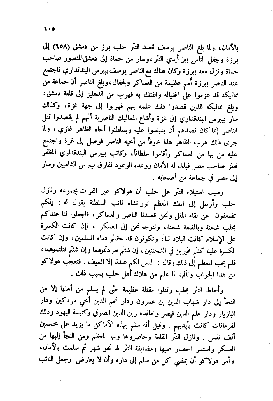 بالأمان، ولما بلغ الناصر يوسف قصد التتر حلب برز من دمشق 658 إلى برزة وجفل الناس بين أيدي التتر، وسار من حماة إلى دمشق المنصور صاحب حماة ونزل معه ببرزة وكان هناك مع الناصر يوسف بيبرس البندقداري فاجتمع عند الناصر ببرزة أُمم عظيمة من العساكر والجفال، وبلغ الناصر أن جماعة من مماليكه قد عزموا على اغتياله والفتك به فهرب من الدهليز إلى قلعة دمشق، وبلغ مماليكه الذين قصدوا ذلك علمه بهم فهزموا إلى جهة غزة، وكذلك سار بيبرس البندقداري إلى غزة وأشاع المماليك الناصرية أنهم لم يقصدوا قتل الناصر إنما كان قصدهم أن يقبضوا عليه ويسلطنوا أخاه الظاهر غازي، ولما جرى ذلك هرب الظاهر هذا خوفاً من أخيه الناصر فوصل إلى غزة واجتمع عليه من بها من العساكر وأقاموا سلطاناً، وكاتب بيبرس البندقداري المظفر قطز صاحب مصر فبذل له الأمان ووعده الوعود ففارق بيبرس الشاميين وسار إلى مصر في جماعة من أصحابه.