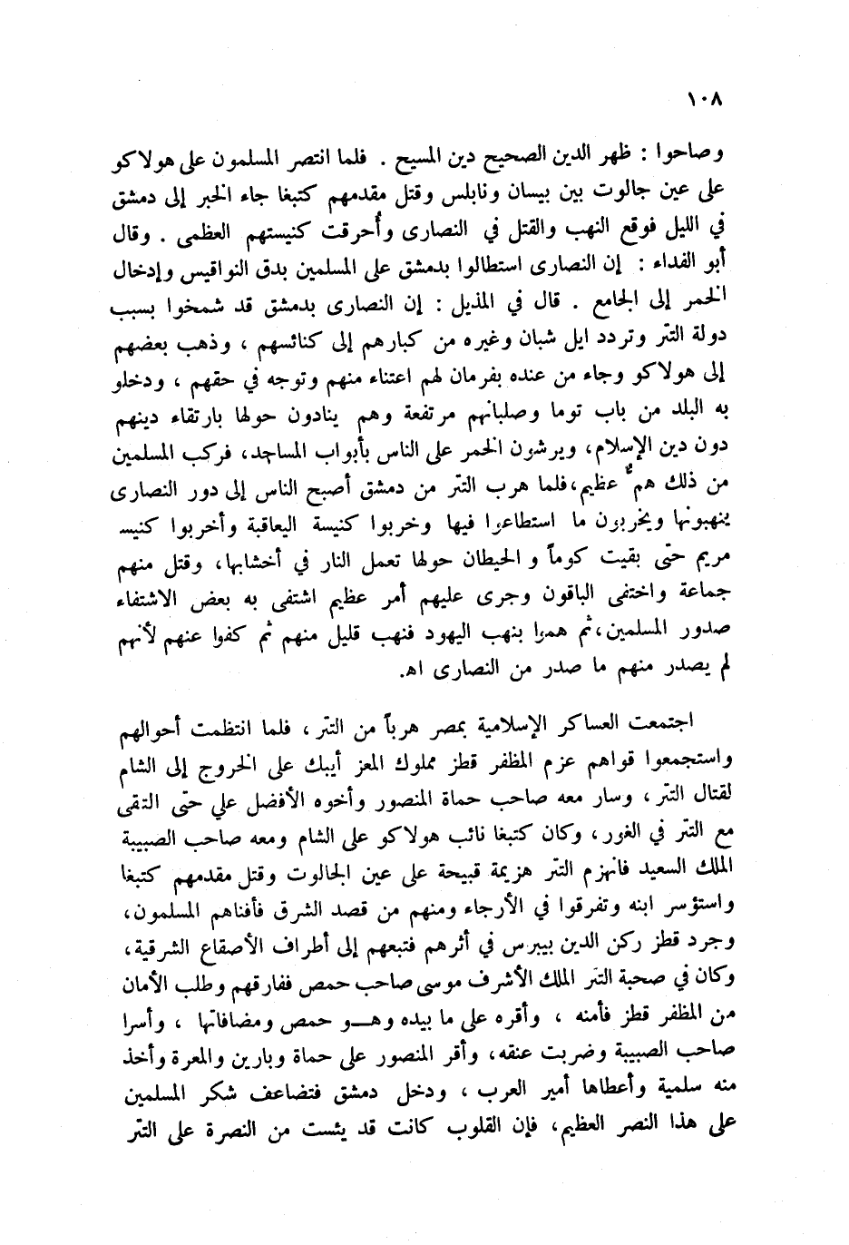 وصاحوا: ظهر الدين الصحيح دين المسيح. فلما انتصر المسلمون على هولاكو على عين جالوت بين بيسان ونابلس وقتل مقدمهم كتبغا جاء الخبر إلى دمشق في الليل فوقع النهب والقتل في النصارى وأُحرقت كنيستهم العظمى. وقال أبو الفداء: إن النصارى استطالوا بدمشق على المسلمين بدق النواقيس وإدخال الخمر إلى الجامع.