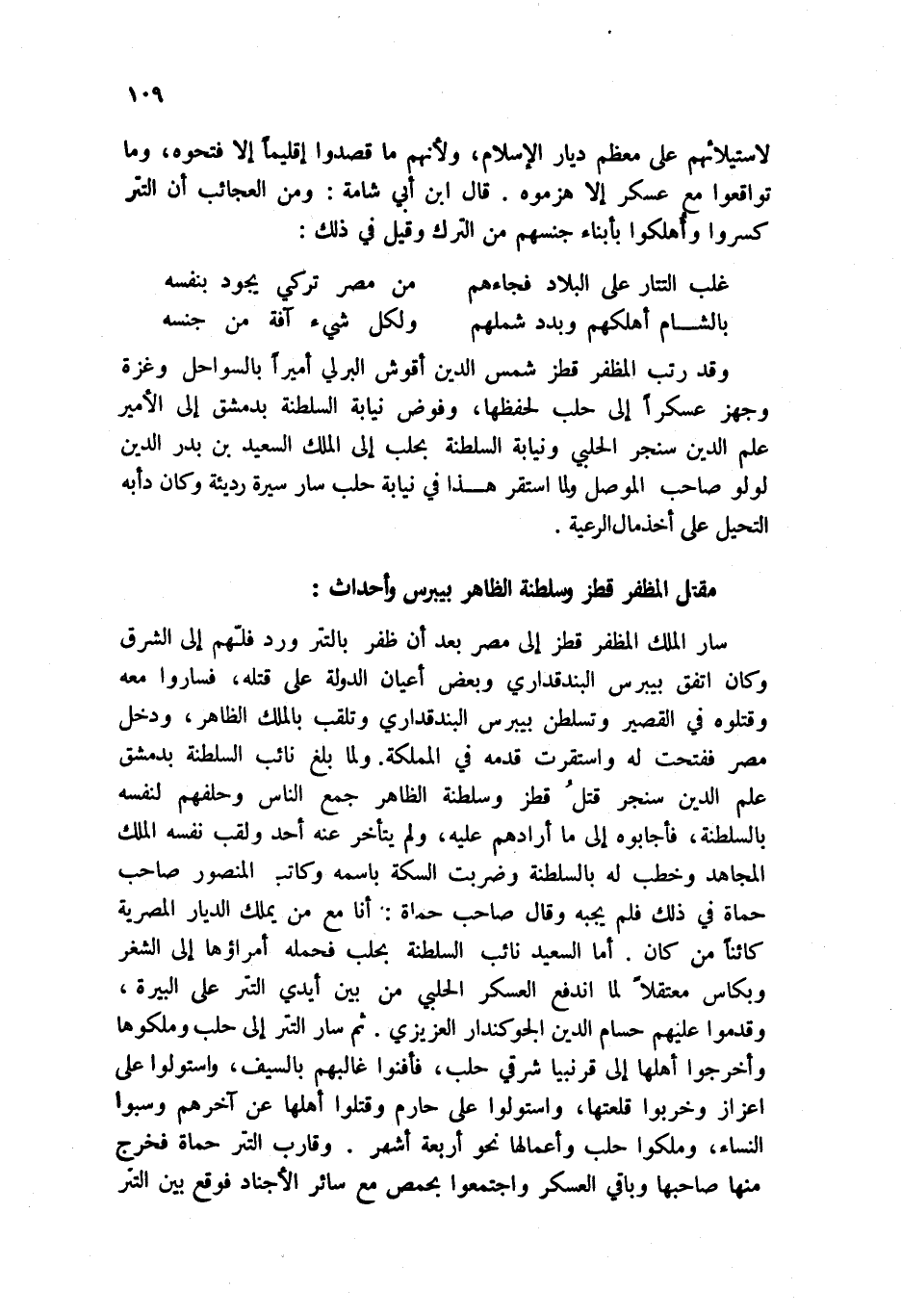 معظم ديار الإسلام، ولأنهم ما قصدوا إقليماً إلا فتحوه، وما تواقعوا مع عسكر إلا هزموه. قال ابن أبي شامة: ومن العجائب أن التتر كسروا وأهلكوا بأبناء جنسهم من الترك وقيل في ذلك: