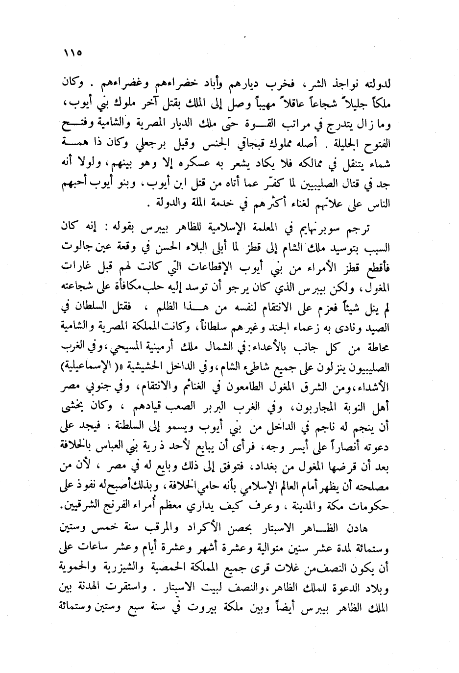 لدولته نواجذ الشر، فخرب ديارهم وأباد خضراءهم وغضراءهم. وكان ملكاً جليلاً شجاعاً عاقلاً مهيباً وصل إلى الملك بقتل آخر ملوك بني أيوب، وما زال يتدرج في مراتب القوة حتى ملك الديار المصرية والشامية وفتح الفتوح الجليلة. أصله مملوك قبجاقي الجنس وقيل برجعلي وكان ذا همة شماء يتنقل في ممالكه فلا يكاد يشعر به عسكره إلا وهو بينهم، ولولا أنه جد في قتال الصليبيين لما كفّر عما أتاه من قتل ابن أيوب، وبنو أيوب أحبهم الناس على علاتهم لغناء أكثرهم في خدمة الملة والدولة.