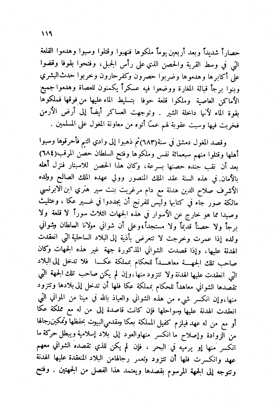 حصاراً شديداً وبعد أربعين يوماً ملكوها فنهبوا وقتلوا وسبوا وهدموا القلعة التي في وسط القرية والحصن الذي على رأس الجبل، وفتحوا بقوفا وقضوا على أكابرها وهدموها وضربوا حصرون وكفر حارون وخربوا حدث البشري وبنوا برجاً قبالة المغارة ووضعوا فيه عسكراً يكمنون للعصاة وهدموا جميع الأماكن العاصية وملكوا قلعة حوفا بتسليط الماء عليها من فوقها فملكوها بقوة الماء لأنها داخلة الشير. وتوجهت العساكر أيضاً إلى أرض الأرمن فخربت فيها وسبت عقوبة لهم عمّا أتوه من معاونة المغول على المسلمين.