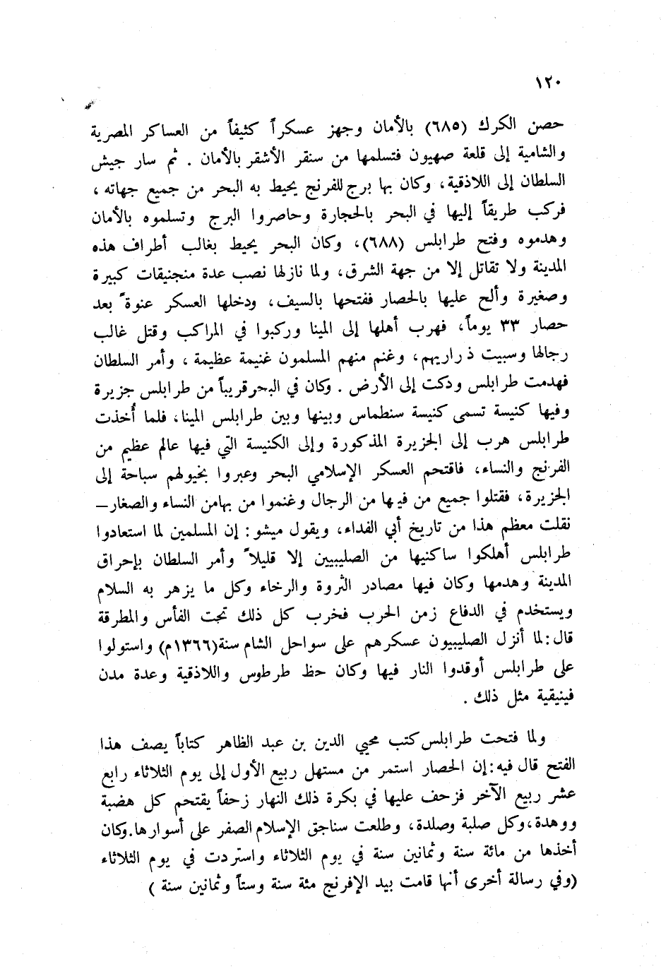 حصن الكرك 685 بالأمان وجهز عسكراً كثيفاً من العساكر المصرية والشامية إلى قلعة صهيون فتسلمها من سنقر الأشقر بالأمان. ثم سار جيش السلطان إلى اللاذقية، وكان بها برج للفرنج يحيط به البحر من جميع جهاته، فركب طريقاً إليها في البحر بالحجارة وحاصروا البرج وتسلموه بالأمان وهدموه وفتح طرابلس 688، وكان البحر يحيط بغالب أطراف هذه المدينة ولا تقاتل إلا من جهة الشرق، ولما نازلها نصب عدة منجنيقات كبيرة وصغيرة وألح عليها بالحصار ففتحها بالسيف، ودخلها العسكر عنوةً بعد حصار 33 يوماً، فهرب أهلها إلى المينا وركبوا في المراكب وقتل غالب رجالها وسبيت ذراريهم، وغنم منهم المسلمون غنيمة عظيمة، وأمر السلطان فهدمت طرابلس ودكت إلى الأرض. وكان في البحر قريباً من طرابلس جزيرة وفيها كنيسة تسمى كنيسة سنطماس وبينها وبين طرابلس المينا، فلما أخذت طرابلس هرب إلى الجزيرة المذكورة وإلى الكنيسة التي فيها عالم عظيم من الفرنج والنساء، فاقتحم العسكر الإسلامي البحر وعبروا بخيولهم سباحة إلى الجزيرة، فقتلوا جميع من فيها من الرجال وغنموا من بها من النساء والصغار - نقلت معظم هذا من تاريخ أبي الفداء، ويقول ميشو: إن المسلمين لما استعادوا طرابلس أهلكوا ساكنيها من الصليبيين إلا قليلاً وأمر السلطان بإحراق المدينة وهدمها وكان فيها مصادر الثروة والرخاء وكل ما يزهو به السلام ويستخدم في الدفاع زمن الحرب فخرب كل ذلك تحت الفأس والمطرقة قال: لما