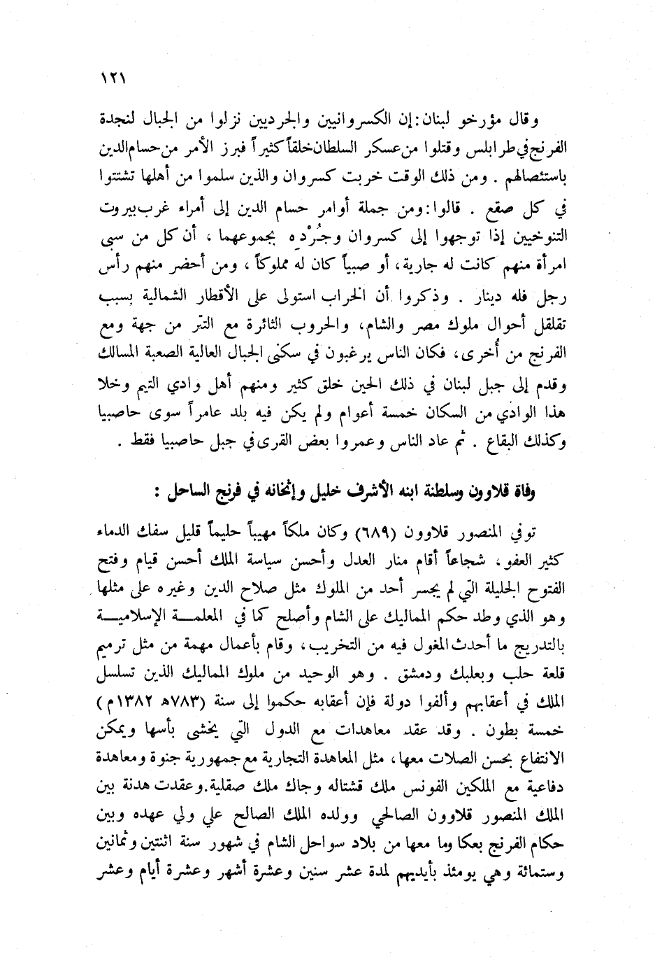 توفي المنصور قلاوون 689 وكان ملكاً مهيباً حليماً قليل سفك الدماء كثير العفو، شجاعاً أقام منار العدل وأحسن سياسة الملك أحسن قيام وفتح الفتوح الجليلة التي لم يجسر أحد من الملوك مثل صلاح الدين وغيره على مثلها وهو الذي وطد حكم المماليك على الشام وأصلح كما في المعلمة الإسلامية بالتدريج ما أحدث المغول فيه من التخريب، وقام بأعمال مهمة من مثل ترميم قلعة حلب وبعلبك ودمشق. وهو الوحيد من ملوك المماليك الذين تسلسل الملك في أعقابهم وألفوا دولة فإن أعقابه حكموا إلى سنة 783هـ 1382م خمسة بطون. وقد عقد معاهدات مع الدول التي يخشى بأسها ويمكن الانتفاع بحسن الصلات معها، مثل المعاهدة التجارية مع جمهورية جنوة ومعاهدة دفاعية مع الملكين الفونس ملك قشتاله وجاك ملك صقلية. وعقدت هدنة بين الملك المنصور قلاوون الصالحي وولده الملك الصالح علي ولي عهده وبين حكام الفرنج بعكا وما معها من بلاد سواحل الشام في شهور سنة اثنتين وثمانين وستمائة وهي يومئذ بأيديهم لمدة عشر سنين وعشرة أشهر وعشرة أيام وعشر