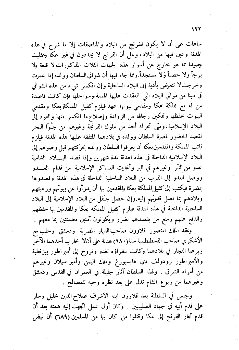 ساعات على أن لا يكون للفرنج من البلاد والمناصفات إلا ما شرح في هذه الهدنة وعين فيها من البلاد، وعلى أن الفرنج لا يجددون في غير عكا وعثليث وصيدا مما هو خارج عن أسوار هذه الجهات الثلاث المذكورات لا قلعة ولا برجاً ولا حصناً ولا مستجداً. ومما جاء فيها أن شواني السلطان وولده إذا عمرت وخرجت لا تتعرض بأذية إلى البلاد الساحلية وإن انكسر شيء من هذه الشواني في مينا من مواني البلاد التي انعقدت عليها الهدنة وسواحلها فإن كانت قاصدة من له مع مملكة عكا ومقدمي بيوتها عهد فيلزم كفيل المملكة بعكا ومقدمي البيوت بحفظها وتمكين رجالها من الزوادة وإصلاح ما انكسر منها والعود إلى