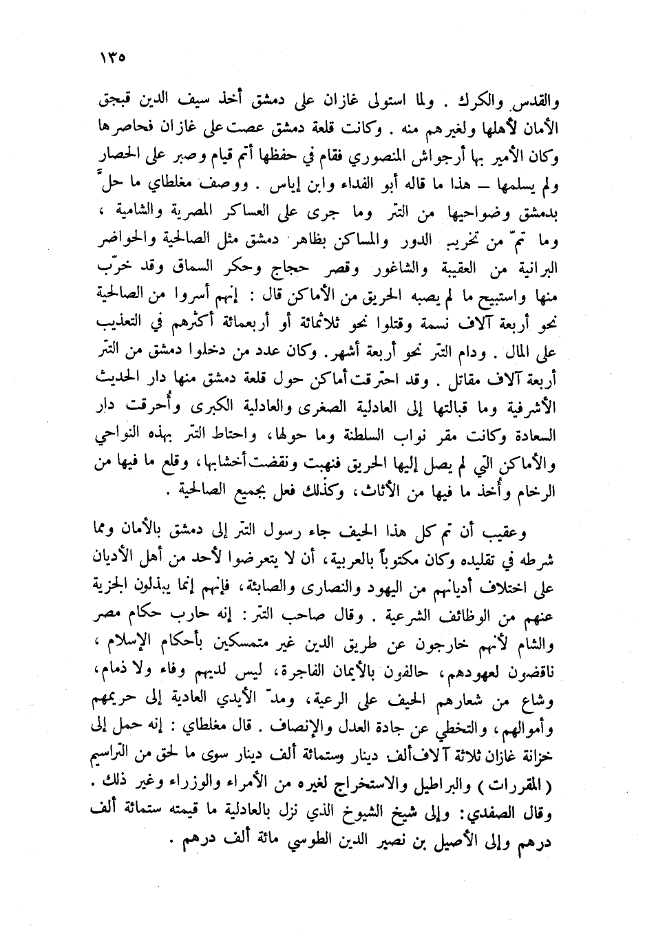 والقدس والكرك. ولما استولى غازان على دمشق أخذ سيف الدين قبجق الأمان لأهلها ولغيرهم منه. وكانت قلعة دمشق عصت على غازان فحاصرها وكان الأمير بها أرجواش المنصوري فقام في حفظها أتم قيام وصبر على الحصار ولم يسلمها - هذا ما قاله أبو الفداء وابن إياس -. ووصف مغلطاي ما حل بدمشق وضواحيها من التتر وما جرى على العساكر المصرية والشامية، وما تم من تخريم الدور والمساكن بظاهر دمشق مثل الصالحية والحواضر البرانية من العقيبة والشاغور وقصر حجاج وحكر السماق وقد خرب منها واستبيح ما لم يصبه الحريق من الأماكن قال: إنهم أسروا من الصالحية نحو أربعة آلاف نسمة وقتلوا نحو ثلاثمائة أو أربعمائة أكثرهم في التعذيب على المال. ودام التتر نحو أربعة أشهر. وكان عدد من دخلوا دمشق من التتر أربعة آلاف مقاتل. وقد احترقت