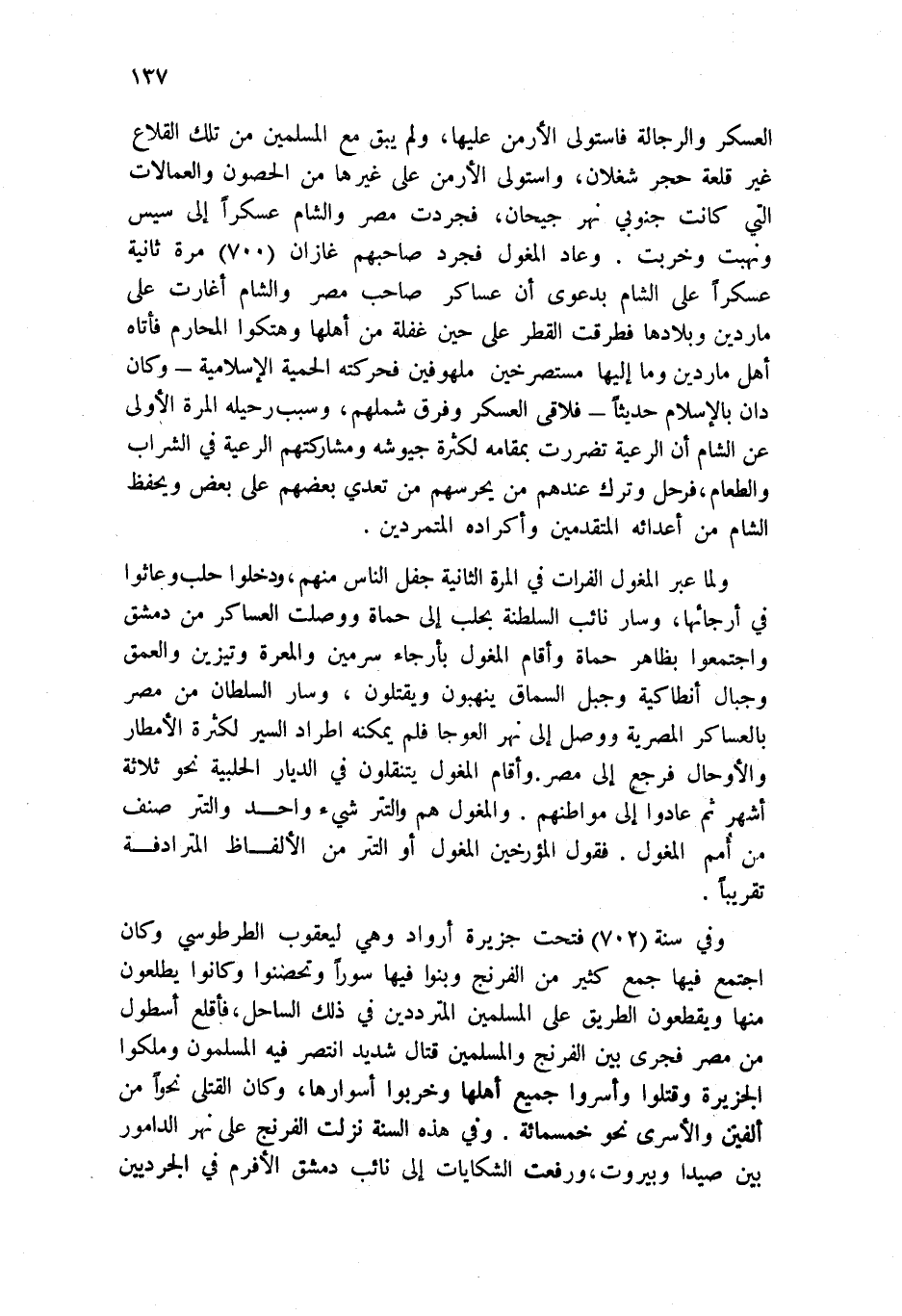 حجر شغلان، واستولى الأرمن على غيرها من الحصون والعمالات التي كانت جنوبي نهر جيحان، فجردت مصر والشام عسكراً إلى سيس ونهبت وخربت. وعاد المغول فجرد صاحبهم غازان 700 مرة ثانية عسكراً على الشام بدعوى أن عساكر صاحب مصر والشام أغارت على ماردين وبلادها فطرقت القطر على حين غفلة من أهلها وهتكوا المحارم فأتاه أهل ماردين وما إليها مستصرخين ملهوفين فحركته الحمية الإسلامية - وكان دان بالإسلام حديثاً - فلاقى العسكر وفرق شملهم، وسبب رحيله المرة الأولى عن الشام أن الرعية تضررت بمقامه لكثرة جيوشه ومشاركتهم الرعية في الشراب والطعام، فرحل وترك عندهم من يحرسهم من تعدي بعضهم على بعض ويحفظ الشام من أعدائه المتقدمين وأكراده المتمردين.