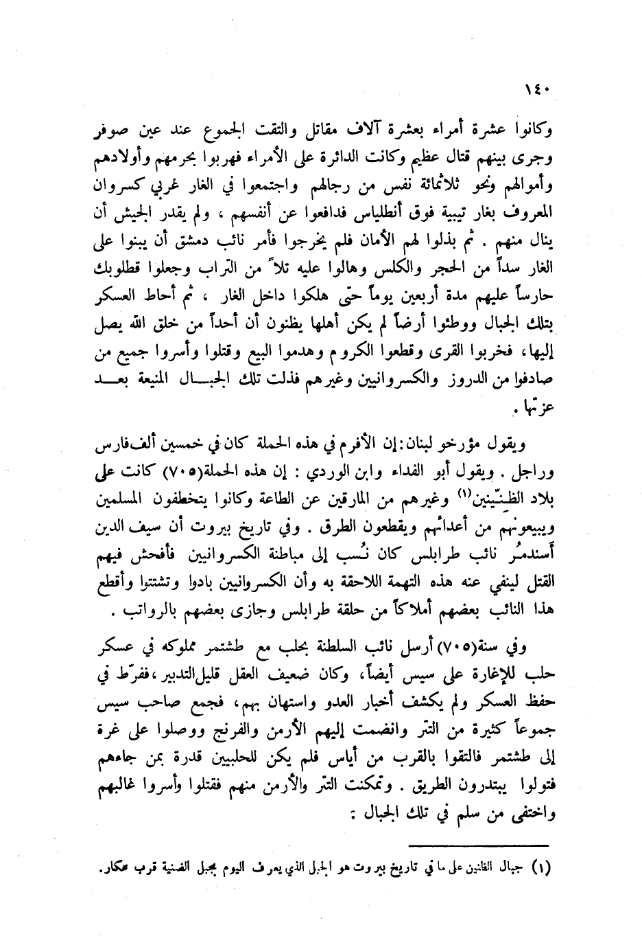 وراجل. ويقول أبو الفداء وابن الوردي: إن هذه الحملة 705 كانت على بلاد الظنينين غيرهم من المارقين عن الطاعة وكانوا يتخطفون المسلمين ويبيعونهم من أعدائهم ويقطعون الطرق. وفي تاريخ بيروت أن سيف الدين أسندمر نائب طرابلس كان نسب إلى مباطنة الكسروانيين فأفحش فيهم القتل لينفي عنه هذه التهمة اللاحقة به وأن الكسروانيين بادوا وتشتتوا وأقطع هذا النائب بعضهم أملاكاً من حلقة طرابلس وجازى بعضهم بالرواتب.