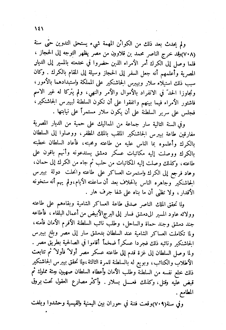 ولم يحدث بعد ذلك من الكوائن المهمة شيء يستحق التدوين حتى سنة 708 وقد خرج الناصر محمد بن قلاوون من مصر يظهر التوجه إلى الحجاز، فلما وصل إلى الكرك أمر الأمراء الذين حضروا في خدمته بالمسير إلى الديار المصرية وأعلمهم أنه جعل السفر إلى الحجاز وسيلة إلى المقام بالكرك. وكان سبب ذلك استيلاء سلار وبيبرس الجاشنكير على المملكة واستبدادهما بالأمور، وتجاوزا الحد في الانفراد بالأموال والأمر والنهي، ولم يتركا له غير الاسم فاشتور الأمراء فيما بينهم واتفقوا على أن تكون السلطنة لبيبرس الجاشنكير، فجلس على سرير السلطنة على أن يكون سلار مستمراً على نيابتها.
