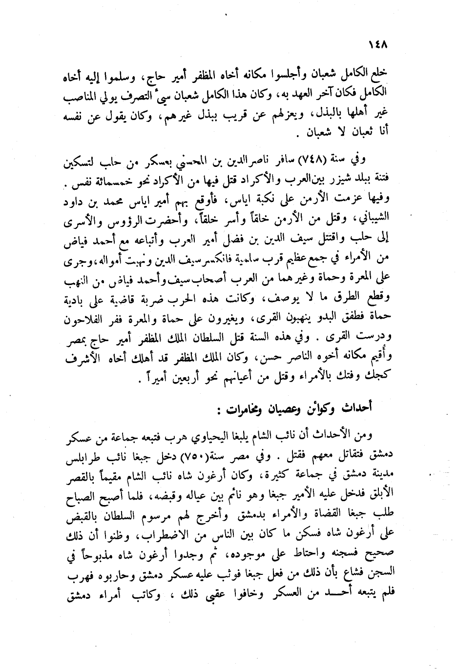 وفي سنة 748 سافر ناصر الدين بن المحسني بعسكر من حلب لتسكين فتنة ببلد شيزر بين العرب والأكراد قتل فيها من الأكراد نحو خمسمائة نفس. وفيها عزمت الأرمن على نكبة اياس، فأوقع بهم أمير اياس محمد بن داود الشيباني، وقتل من الأرمن خلقاً وأسر خلقاً، وأحضرت الرؤوس والأسرى إلى حلب واقتتل سيف الدين بن فضل أمير العرب وأتباعه مع أحمد فياض من الأمراء في جمع عظيم