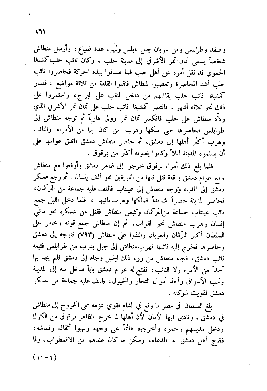 فما بلغ ذلك أمراء برقوق خرجوا إلى ظاهر دمشق وأوقعوا مع منطاش ومع عوام دمشق واقعة قتل فيها من الفريقين نحو ألف إنسان، ثم رجع عسكر دمشق إلى المدينة وتوجه منطاش إلى عينتاب فالتف عليه جماعة من التركمان، فحاصر المدينة حصراً شديداً فملكها وهرب نائبها، فلما دخل الليل جمع نائب عينتاب جماعة من التركمان وكبس منطاش فقتل من عسكره نحو مائتي إنسان وهرب منطاش نحو الفرات، ثم إن منطاش جمع قوته وخامر على السلطان أكثر التركمان والعربان والتفوا على منطاش 793 فتوجه إلى دمشق وحاصرها فخرج إليه نائبها فهرب منطاش إلى جبل يقرب من طرابلس فتبعه نائب دمشق، فجاء منطاش من وراء ذلك الجبل وجاء إلى دمشق فلم يجد بها أحداً من الأمراء ولا النائب، ففتح له عوام دمشق باباً فدخل منه إلى المدينة ونهب الأسواق وأخذ أموال التجار والخيول، والتف عليه جماعة من عسكر دمشق فقويت شوكته.