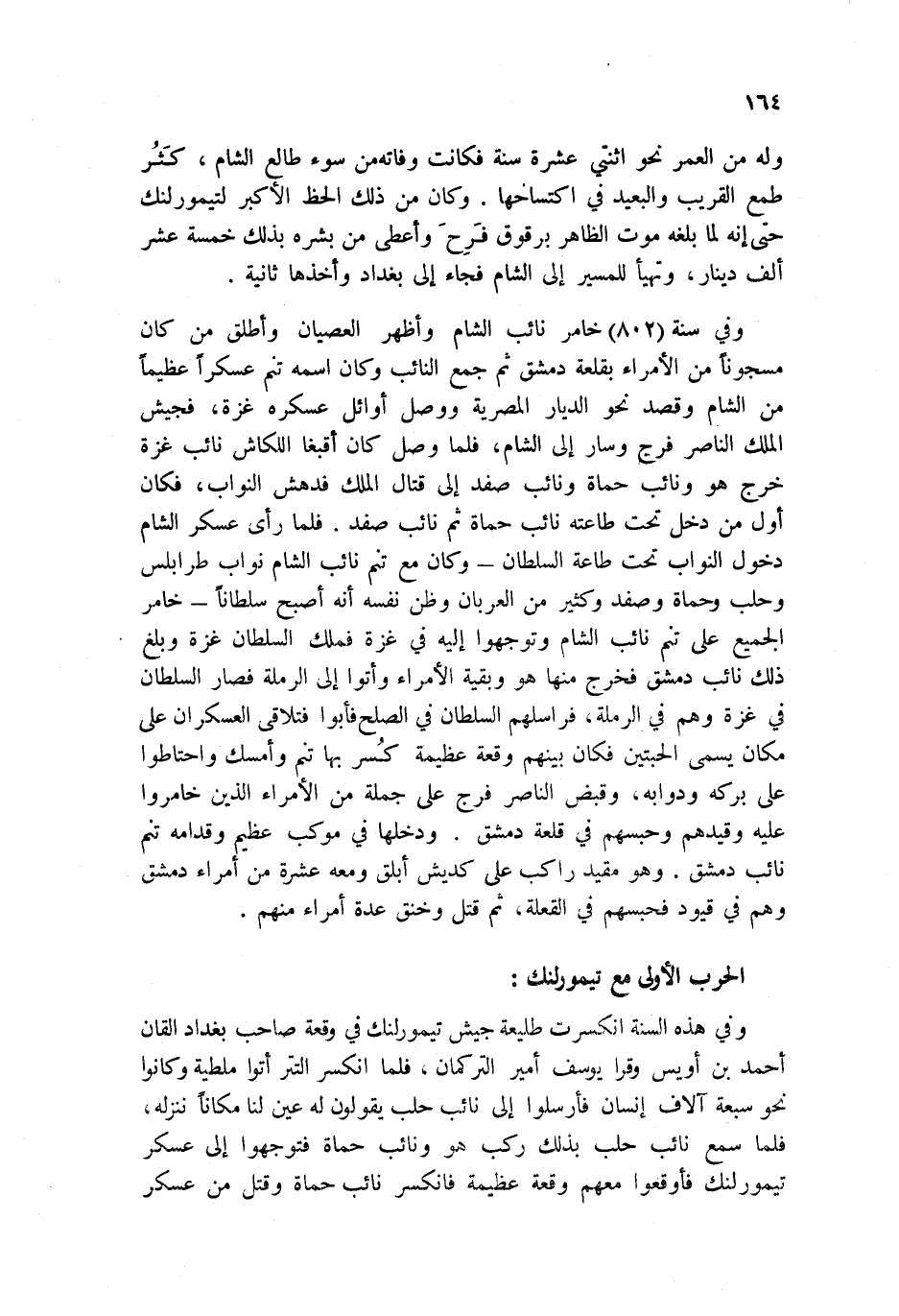 وفي هذه السنة انكسرت طليعة جيش تيمورلنك في وقعة صاحب بغداد القان أحمد بن أويس وقرا يوسف أمير التركمان، فلما انكسر التتر أتوا ملطية وكانوا نحو سبعة آلاف إنسان فأرسلوا إلى نائب حلب يقولون له عين لنا مكاناً ننزله، فلما سمع نائب حلب بذلك ركب هو ونائب حماة فتوجهوا إلى عسكر تيمورلنك فأوقعوا معهم وقعة عظيمة فانكسر نائب حماة وقتل من عسكر