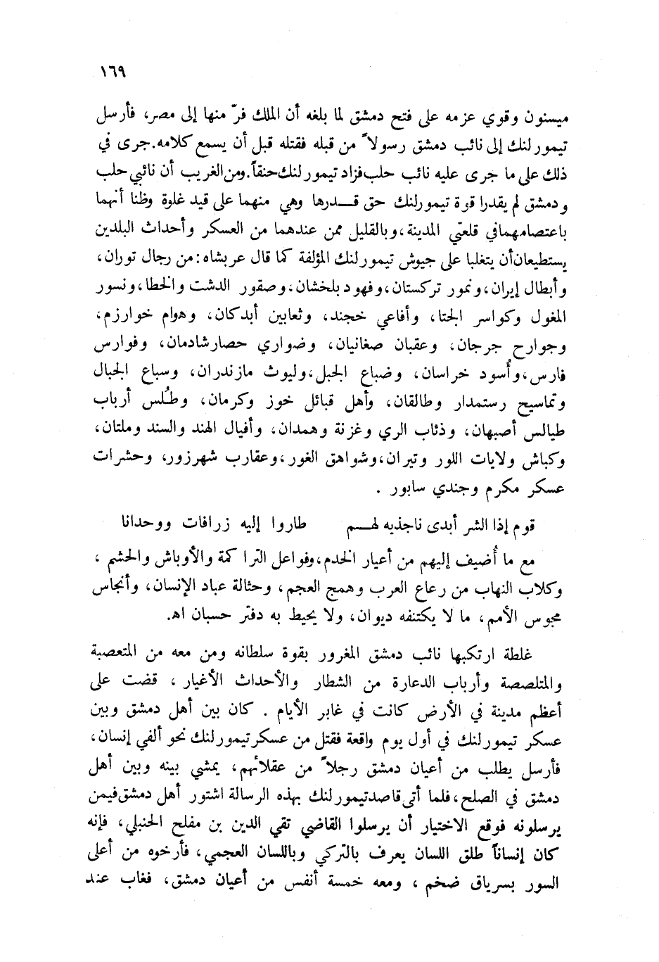 ميسنون وقوي عزمه على فتح دمشق لما بلغه أن الملك فر منها إلى مصر، فأرسل تيمورلنك إلى نائب دمشق رسولاً من قبله فقتله قبل أن يسمع كلامه. جرى في ذلك على ما جرى عليه نائب حلب فزاد تيمورلنك حنقاً. ومن الغريب أن نائبي حلب ودمشق لم يقدرا قوة تيمورلنك حق قدرها وهي منهما على قيد غلوة وظنا أنهما باعتصامهما في قلعتي المدينة، وبالقليل ممن عندهما من العسكر وأحداث البلدين يستطيعان أن يتغلبا على جيوش تيمورلنك المؤلفة كما قال عربشاه: من رجال توران، وأبطال إيران، ونمور تركستان، وفهود بلخشان،