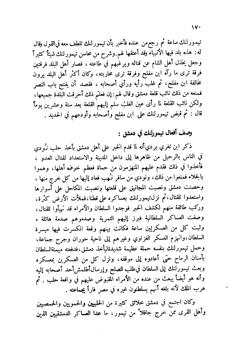 عن قتاله ويرغبهم في طاعته، فصار أهل البلد فرقتين فرقة ترى ما رآه ابن مفلح وفرقة ترى محاربته، وكان أكثر أهل البلد يرون مخالفة ابن مفلح، ثم غلب رأيه ورأي أصحابه، فقصد أن يفتح باب النصر فمنعه من ذلك نائب قلعة دمشق وقال لهم: إن فعلتم ذلك أحرقت البلدة جميعها، ولكن نائب القلعة لما رأى عين الغلب سلم إليهم القلعة بعد ستة وعشرين يوماً قال: ثم قبض تيمورلنك على ابن مفلح وأصحابه وأودعهم في الحديد.