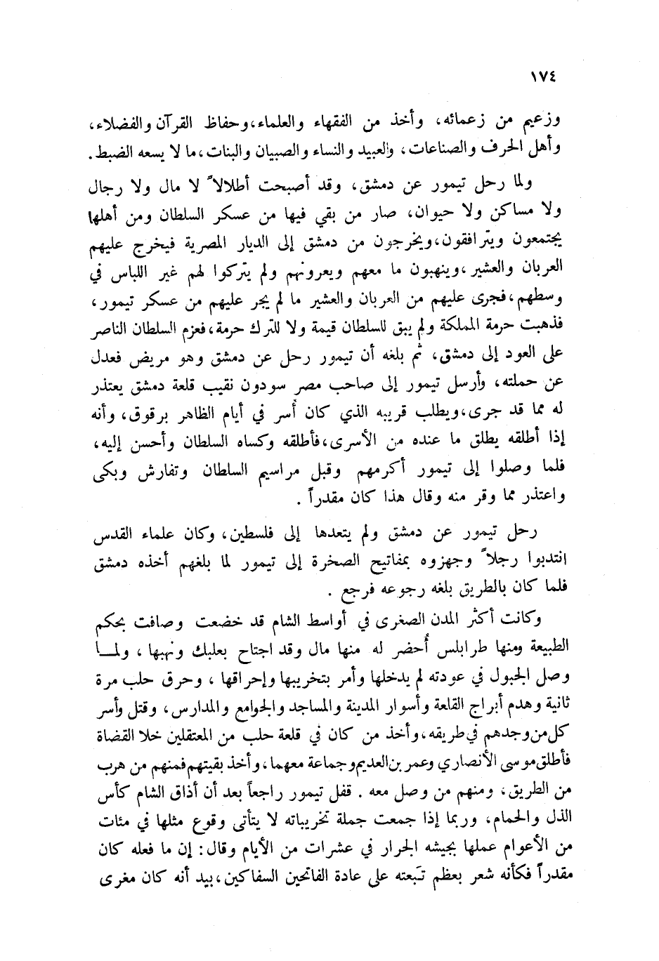 ولما رحل تيمور عن دمشق، وقد أصبحت أطلالاً لا مال ولا رجال ولا مساكن ولا حيوان، صار من بقي فيها من عسكر السلطان ومن أهلها يجتمعون ويترافقون، ويخرجون من دمشق إلى الديار المصرية فيخرج عليهم العربان والعشير، وينهبون ما معهم ويعرونهم ولم يتركوا لهم غير اللباس في وسطهم، فجرى عليهم من العربان والعشير ما لم يجر عليهم من عسكر تيمور، فذهبت حرمة المملكة ولم يبق للسلطان قيمة ولا للترك حرمة، فعزم السلطان الناصر على العود إلى دمشق، ثم بلغه أن تيمور رحل عن دمشق وهو مريض فعدل عن