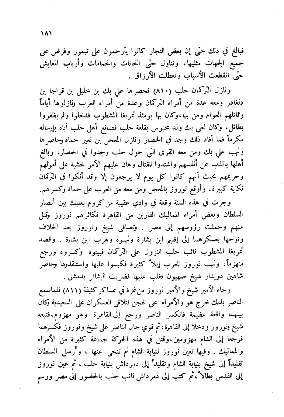 ونازل التركمان حلب 810 فحصرها علي بك بن خليل بن قراجا بن دلغادر ومعه عدة من أمراء التركمان وعدة من أمراء العرب ونازلوها أياماً وقاتلهم العوام ومن بها، وكان بها يومئذ تمربغا المشطوب فدخلوا ولم يظفروا بطائل، وكان لعلي بك ولد محبوس بقلعة حلب فصانع أهل حلب أباه بإرساله مكرماً فما أفاد ذلك وجد في الحصار ونازل المعجل بن نعير حماة وحاصرها ونهب علي