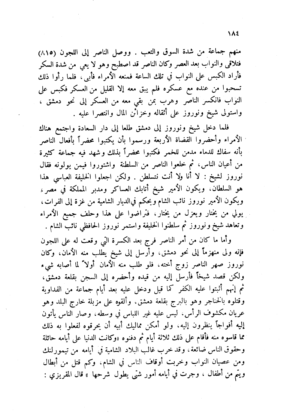 منهم جماعة من شدة السوق والتعب. ووصل الناصر إلى اللجون 815 فتلاقى والنواب بعد العصر وكان الناصر قد اصطبح وهو لا يعي من شدة السكر فأراد الكبس على النواب في تلك الساعة فمنعه الأمراء فأبى، فلما رأوا ذلك تسحبوا من عنده مع عسكره فلم يبق معه إلا القليل من العسكر فكبس على النواب فانكسر الناصر وهرب بمن بقي معه من العسكر إلى نحو دمشق، واستولى شيخ ونوروز على أثقاله وخزائن المال وانتصرا عليه.