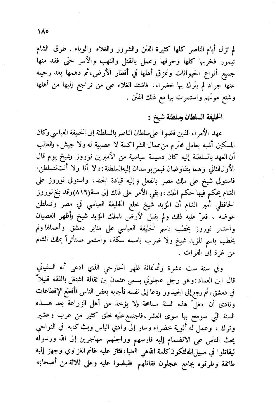 لم تزل أيام الناصر كلها كثيرة الفتن والشرور والغلاء والوباء. طرق الشام تيمور فخربها كلها وحرقها وعمل بالقتل والنهب والأسر حتى فقد منها جميع أنواع الحيوانات وتمزق أهلها في أقطار الأرض، ثم دهمها بعد رحيله عنها جراد لم يترك بها خضراء، فاشتد الغلاء على من تراجع إليها من أهلها وشنع موتهم واستمرت بها مع ذلك الفتن.