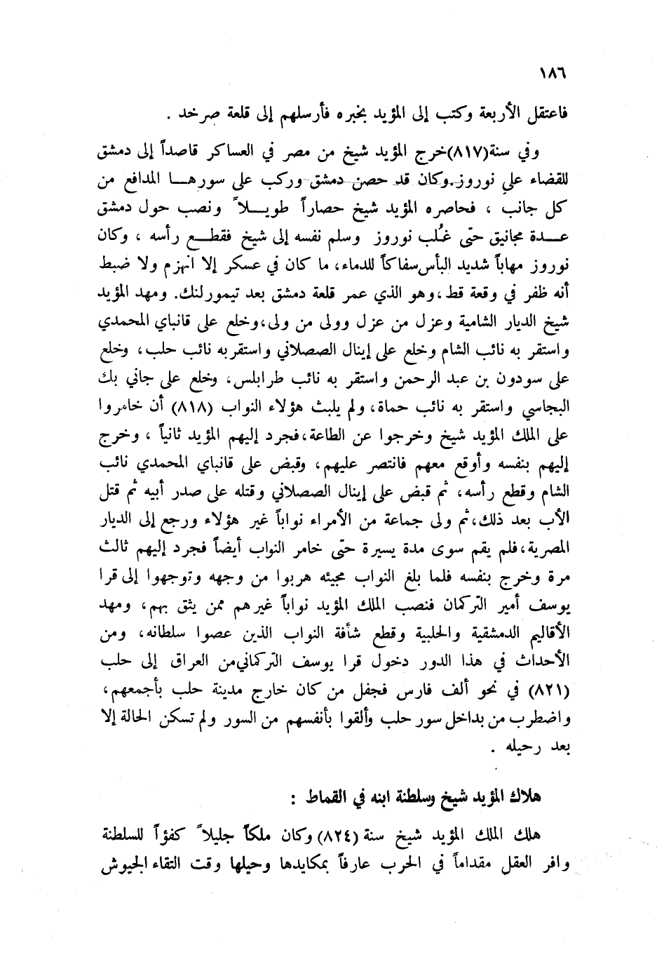 هلك الملك المؤيد شيخ سنة 824 وكان ملكاً جليلاً كفؤاً للسلطنة وافر العقل مقداماً في الحرب عارفاً بمكايدها وحيلها وقت التقاء الجيوش