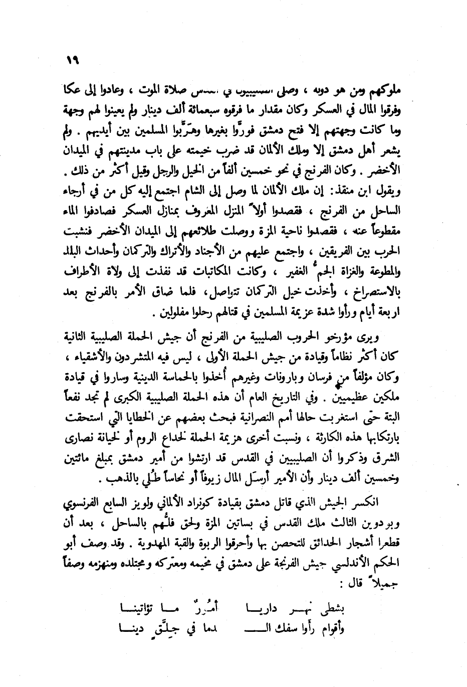 ملوكهم ومن هو دونه، وصلى الصليبيون في القدس صلاة الموت، وعادوا إلى عكا وفرقوا المال في العسكر وكان مقدار ما فرقوه سبعمائة ألف دينار ولم يعينوا لهم وجهة وما كانت وجهتهم إلا فتح دمشق فورّوا بغيرها وهرّبوا المسلمين بين أيديهم. ولم يشعر أهل دمشق إلا وملك الألمان قد ضرب خيمته على باب مدينتهم في الميدان الأخضر. وكان الفرنج في نحو خمسين ألفاً من الخيل والرجل وقيل أكثر من ذلك. ويقول ابن منقذ: إن ملك الألمان لما وصل إلى الشام اجتمع إليه كل من في أرجاء الساحل من الفرنج، فقصدوا أولاً المنزل المعروف بمنازل العسكر فصادفوا الماء مقطوعاً عنه، فقصدوا ناحية المزة ووصلت طلائعهم إلى الميدان الأخضر فنشبت الحرب بين الفريقين، واجتمع عليهم من الأجناد والأتراك والتركمان وأحداث البلد والمطوعة والغزاة الجمّ الغفير، وكانت المكاتبات قد نفذت