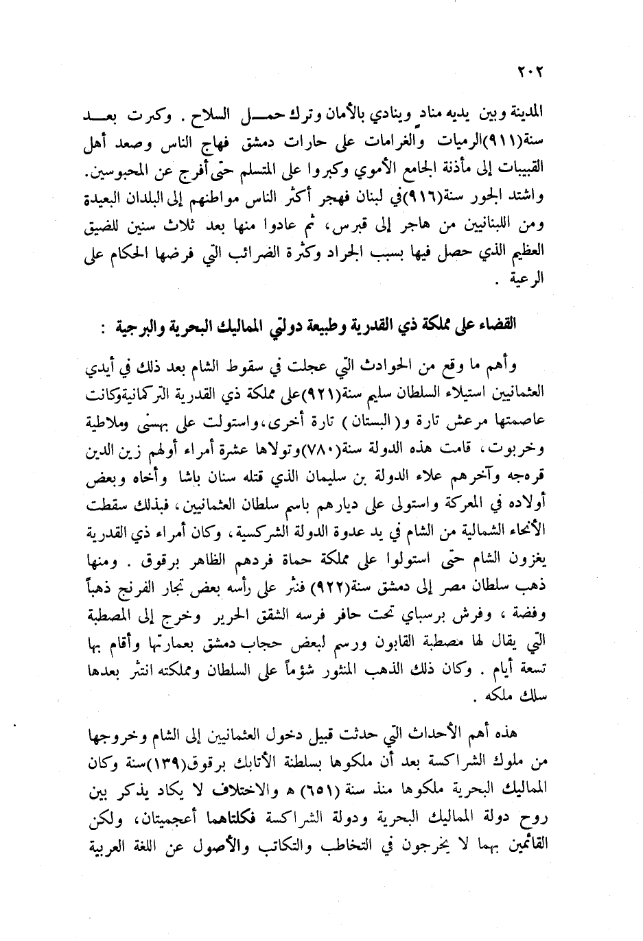 وملاطية وخربوت، قامت هذه الدولة سنة 780 وتولاها عشرة أمراء أولهم زين الدين قره جه وآخرهم علاء الدولة بن سليمان الذي قتله سنان باشا وأخاه وبعض أولاده في المعركة واستولى على ديارهم باسم سلطان العثمانيين، فبذلك سقطت الأنحاء الشمالية من الشام في يد عدوة الدولة الشركسية، وكان أمراء ذي القدرية يغزون الشام حتى استولوا على مملكة حماة فردهم الظاهر برقوق. ومنها ذهب سلطان مصر إلى دمشق سنة 922 فنثر على رأسه بعض تجار الفرنج ذهباً وفضة، وفرش برسباي تحت حافر فرسه الشقق الحرير وخرج إلى المصطبة التي يقال لها مصطبة القابون ورسم لبعض حجاب دمشق بعمارتها وأقام بها تسعة أيام. وكان ذلك الذهب المنثور شؤماً على السلطان ومملكته انتثر بعدها سلك ملكه.
