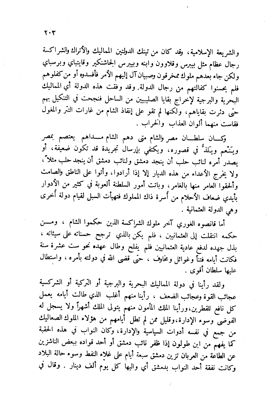 ينجد دمشق ولنائب دمشق أن ينجد حلب مثلاً، ولا يخرج الأعداء من هذه الديار إلا إذا أرادوا، وأتوا على الناطق والصامت وألحقوا العامر منها بالغامر، وباتت أمور السلطنة ألعوبة في كثير من الأدوار بأيدي ضعاف الأحلام من أسرة ذاك المملوك فتهيأت السبل لقيام دولة أخرى وهي الدولة العثمانية.