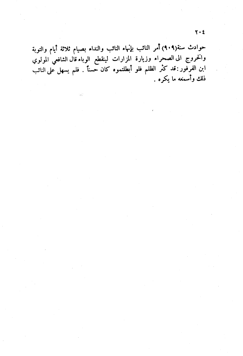 حوادث سنة 909 أمر النائب بإنهاء النائب والنداء بصيام ثلاثة أيام والتوبة والخروج إلى الصحراء وزيارة المزارات لينقطع الوباء قال الشافعي المولوي ابن الفرفور: قد كثر الظلم فلو أبطلتموه كان حسناً. فلم يسهل على النائب ذلك وأسمعه ما يكره.