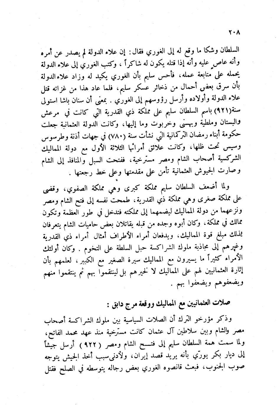 السلطان وشكا ما وقع له إلى الغوري فقال: إن علاء الدولة لم يصدر عن أمره وأنه عاصً عليه وأنه إذا قتله يكون له شاكراً، وكتب الغوري إلى علاء الدولة يحمله على متابعة عمله، فأحس سليم بأن الغوري يكيد له وزاد علاء الدولة بأن سرق بعض أحمال من ذخائر عسكر سليم، فلما عاد هذا من غزاته قتل علاء الدولة وأولاده وأرسل رؤوسهم إلى الغوري. بمعنى أن سنان باشا استولى سنة 921 باسم السلطان سليم على مملكة ذي القدرية التي كانت في مرعش والبستان وملطية وبهنسي وخربوت وما إليها، وكانت الدولة العثمانية جعلت حكومة أبناء رمضان التركمانية التي نشأت سنة 780 في جهات أذنة وطرسوس وسيس تحت ظلها، وكانت علائق أمرائها الثلاثة الأول مع دولة المماليك الشركسية أصحاب الشام ومصر مسترخية، ففتحت السبل والمنافذ إلى الشام وصارت الجيوش العثمانية تأمن على مقدمتها وعلى خط رجعتها.