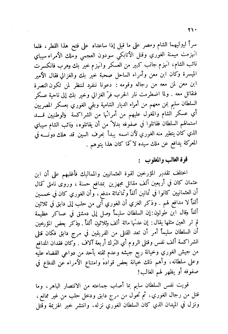 لهم. وذكر الغزي أن الغوري أتى من حلب إلى دابق في ثلاثين ألفاً وقال ابن طولون: إن السلطان سليماً وصل إلى دمشق في عساكر عظيمة لم تر العين مثلها يقال: إن عدتها مائة ألف وثلاثون ألفاً. وذكر بعض المؤرخين أن السلطان سليماً أمر أن تعد القتلى من الفريقين في مرج دابق فكان قتلى الشراكسة ألف نفس وقتلى الروم أي الترك أربعة آلاف. وكان فقدان المدافع من جيش الغوري وخيانة ربع جيشه وعدم ثقته بأحد من دواعي القضاء عليه وعلى سلطانه، وأهم ذلك خيانة بعض قواده وامتناع الأمراء عن الدفاع في صفوفه أو يظهر لهم الغالب