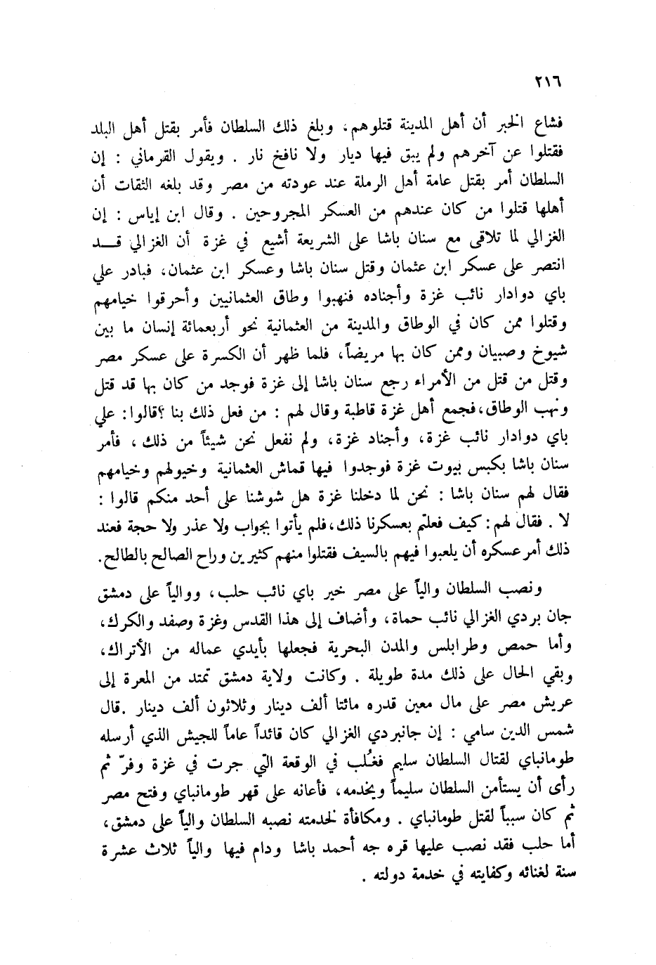 فشاع الخبر أن أهل المدينة قتلوهم، وبلغ ذلك السلطان فأمر بقتل أهل البلد فقتلوا عن آخرهم ولم يبق فيها ديار ولا نافخ نار. ويقول القرماني: إن السلطان أمر بقتل عامة أهل الرملة عند عودته من مصر وقد بلغه الثقات أن أهلها قتلوا من كان عندهم من العسكر المجروحين. وقال ابن إياس: إن الغزالي لما تلاقى مع سنان باشا على الشريعة أشيع في غزة أن الغزالي قد انتصر على عسكر ابن عثمان وقتل سنان باشا وعسكر ابن عثمان، فبادر على باي دوادار نائب غزة وأجناده فنهبوا وطاق العثمانيين وأحرقوا خيامهم وقتلوا ممن كان في الوطاق والمدينة من العثمانية نحو أربعمائة إنسان ما بين شيوخ وصبيان وممن كان بها مريضاً، فلما ظهر أن الكسرة على عسكر مصر وقتل من قتل من الأمراء رجع سنان باشا إلى غزة فوجد من كان بها قد قتل ونهب الوطاق، فجمع أهل غزة قاطبة وقال لهم: من فعل ذلك بنا؟ قالوا: علي باي دوادار نائب غزة، وأجناد غزة، ولم نفعل نحن شيئاً من ذلك، فأمر سنان باشا بكبس بيوت غزة فوجدوا فيها قماش العثمانية وخيولهم وخيامهم فقال لهم سنان باشا: نحن لما دخلنا غزة هل شوشنا على أحد منكم قالوا: لا. فقال لهم: كيف فعلتم بعسكرنا ذلك، فلم يأتوا بجواب ولا عذر ولا حجة فعند ذلك أمر عسكره أن يلعبوا فيهم بالسيف فقتلوا