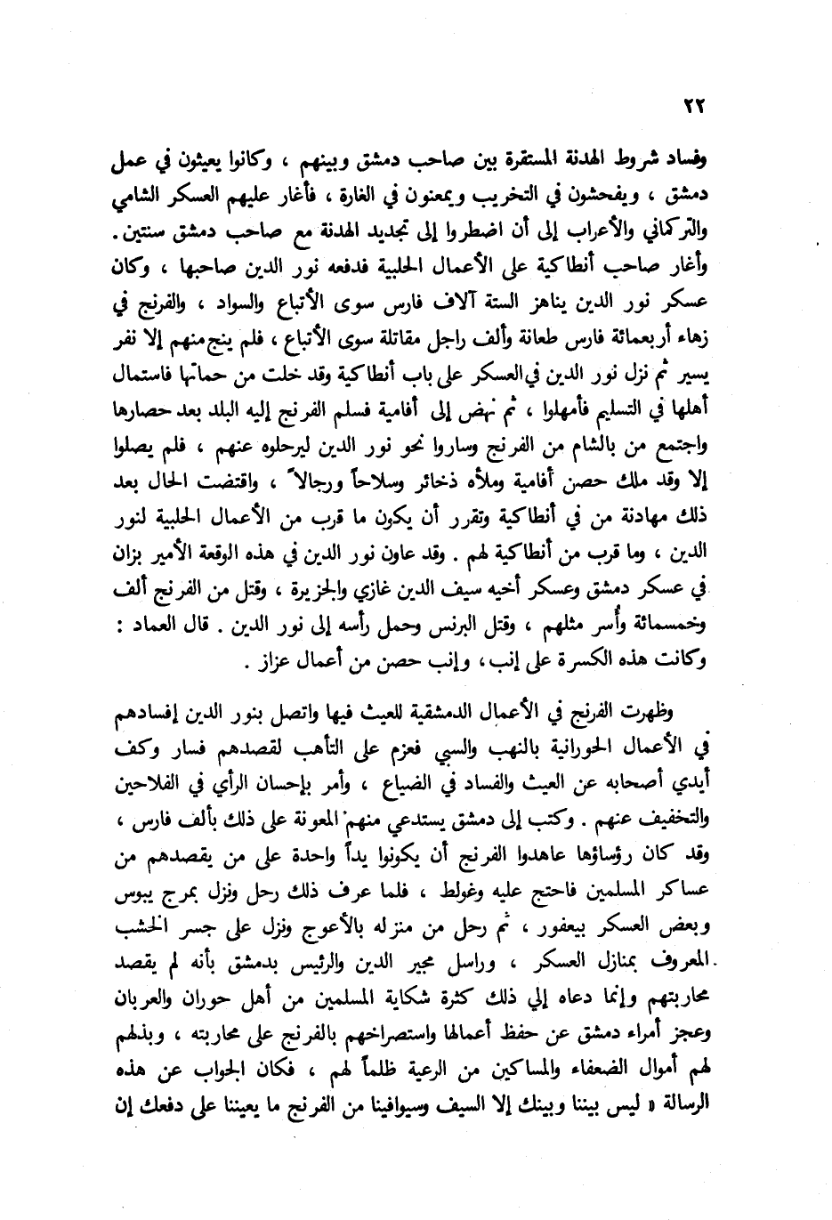 والتخفيف عنهم. وكتب إلى دمشق يستدعي منهم المعونة على ذلك بألف فارس، وقد كان رؤساؤها عاهدوا الفرنج أن يكونوا يداً واحدة على من يقصدهم من عساكر المسلمين فاحتج عليه وغولط، فلما عرف ذلك رحل ونزل بمرج يبوس وبعض العسكر بيعفور، ثم رحل من منزله بالأعوج ونزل على جسر الخشب المعروف بمنازل العسكر، وراسل مجير الدين والرئيس بدمشق بأنه لم يقصد محاربتهم وإنما دعاه إلي ذلك كثرة شكاية المسلمين من أهل حوران والعربان وعجز أمراء دمشق عن حفظ أعمالها واستصراخهم بالفرنج على محاربته، وبذلهم لهم أموال الضعفاء والمساكين من الرعية ظلماً لهم، فكان الجواب عن هذه الرسالة ليس بيننا وبينك إلا السيف وسيوافينا من الفرنج ما يعيننا على دفعك إن