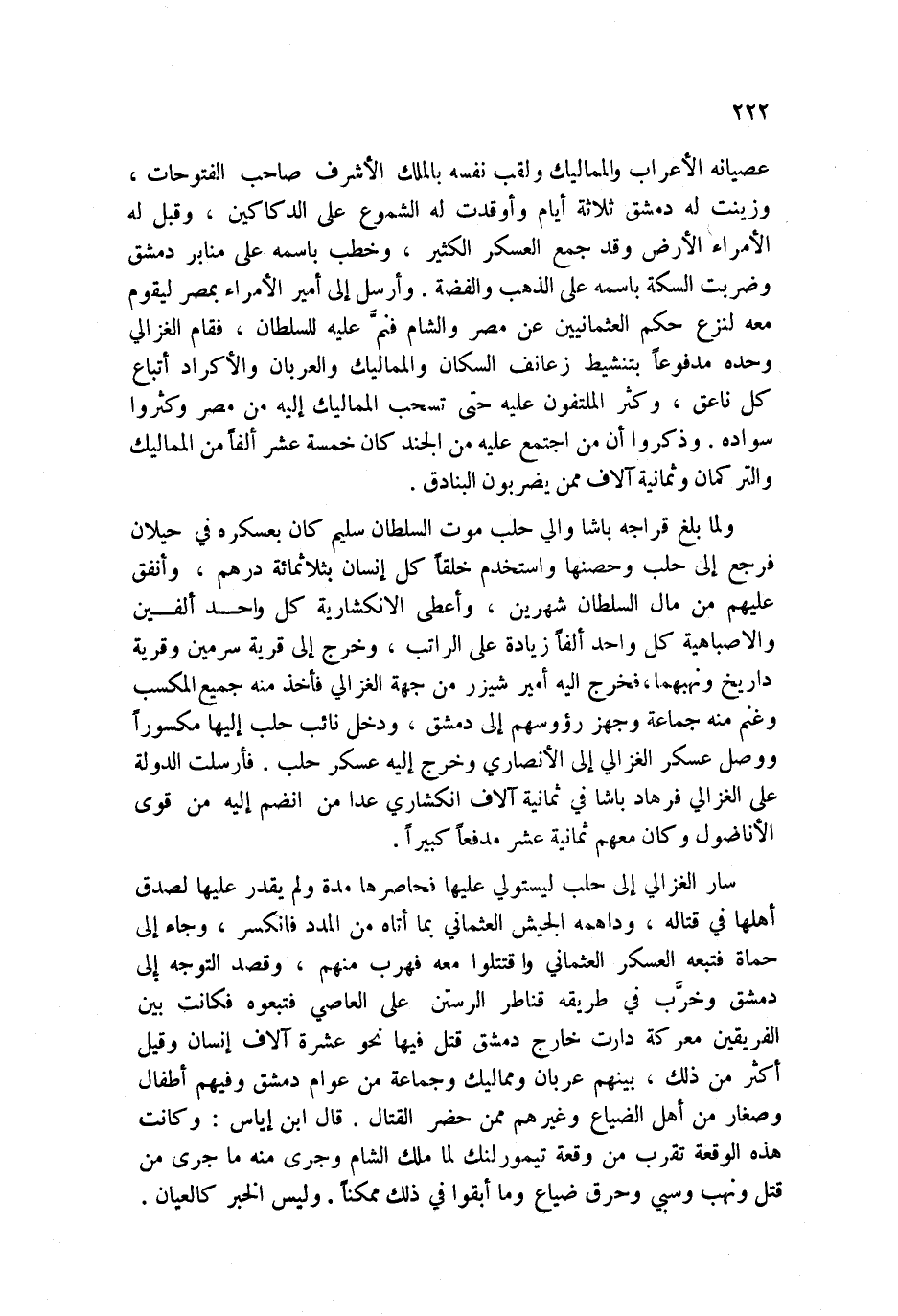 حلب وحصنها واستخدم خلقاً كل إنسان بثلاثمائة درهم، وأنفق عليهم من مال السلطان شهرين، وأعطى الانكشارية كل واحد ألفين والاصباهية كل واحد ألفاً زيادة على الراتب، وخرج إلى قرية سرمين وقرية داريخ ونهبهما، فخرج إليه أمير شيزر من جهة الغزالي فأخذ منه جميع المكسب وغنم منه جماعة وجهز رؤوسهم إلى دمشق، ودخل نائب حلب إليها مكسوراً ووصل عسكر الغزالي إلى الأنصاري وخرج إليه عسكر حلب. فأرسلت الدولة على الغزالي فرهاد باشا في ثمانية آلاف انكشاري عدا من انضم إليه من قوى الأناضول وكان معهم ثمانية عشر مدفعاً كبيراً.