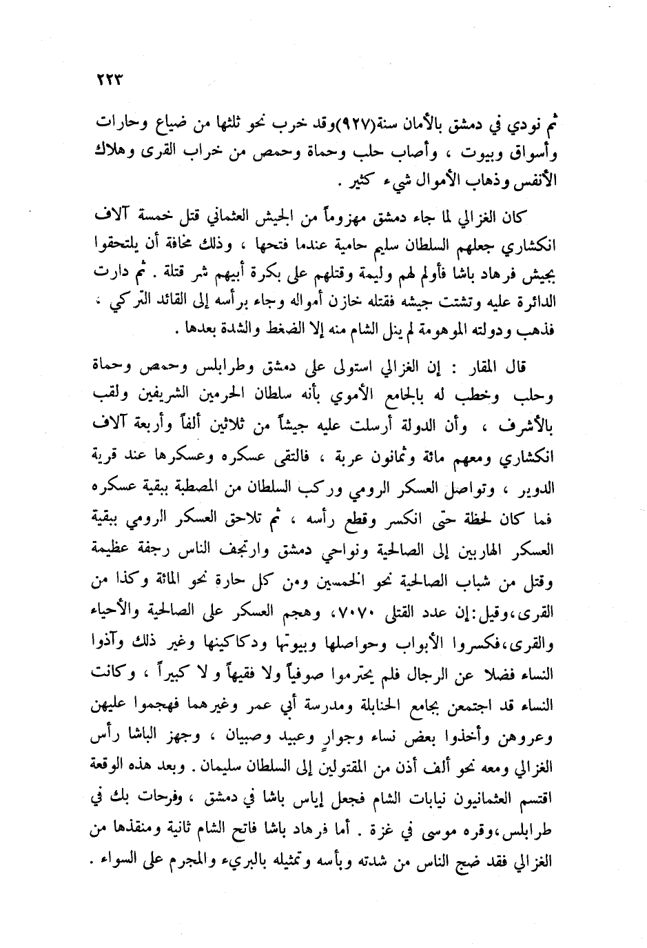 ثم نودي في دمشق بالأمان سنة 927 وقد خرب نحو ثلثها من ضياع وحارات وأسواق وبيوت، وأصاب حلب وحماة وحمص من خراب القرى وهلاك الأنفس وذهاب الأموال شيء كثير.
