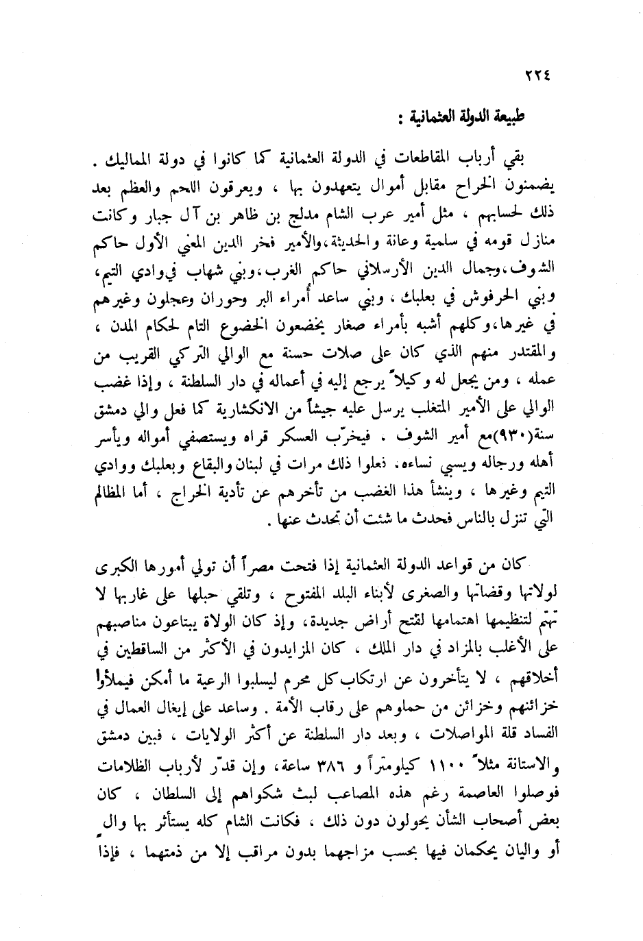 أمير عرب الشام مدلج بن ظاهر بن آل جبار وكانت منازل قومه في سلمية وعانة والحديثة، والأمير فخر الدين المعني الأول حاكم الشوف، وجمال الدين الأرسلاني حاكم الغرب، وبني شهاب في وادي التيم، وبني الحرفوش في بعلبك، وبني ساعد أُمراء البر وحوران وعجلون وغيرهم في غيرها، وكلهم أشبه بأمراء صغار يخضعون الخضوع التام لحكام المدن، والمقتدر منهم الذي كان على صلات حسنة مع الوالي التركي القريب من عمله، ومن يجعل له وكيلاً يرجع إليه في أعماله في دار السلطنة، وإذا غضب الوالي على الأمير المتغلب يرسل عليه جيشاً من الانكشارية كما فعل والي دمشق سنة 930 مع أمير الشوف، فيخرّب العسكر قراه ويستصفي أمواله ويأسر أهله ورجاله ويسبي نساءه، فعلوا ذلك مرات في لبنان والبقاع وبعلبك ووادي التيم وغيرها، وينشأ هذا الغضب من تأخرهم عن تأدية الجراج، أما المظالم التي تنزل بالناس فحدث ما شئت أن تحدث عنها.