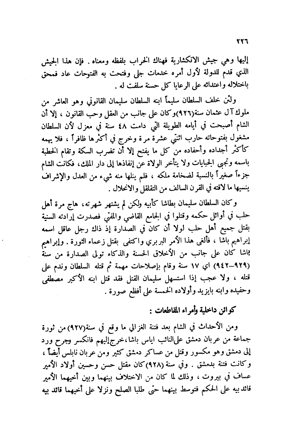 ولئن خلف السلطان سليماً ابنه السلطان سليمان القانوني وهو العاشر من ملوك آل عثمان سنة 926 وكان على جانب من العقل وحب القانون، إلا أن الشام أصبحت في أيامه الطويلة التي دامت 48 سنة في معزل لأن السلطان مشغول بفتوحاته حارب اثنتي عشرة مرة وخرج في أكثرها ظافراً، فلا يهمه كأكثر أجداده وأحفاده من كل ما يفتح إلا أن تضرب السكة وتقام الخطبة باسمه وتجبى الجبايات ولا يتأخر الولاة عن إنفاذها إلى دار الملك، فكانت الشام جزءاً صغيراً بالنسبة لضخامة ملكه، فلم ينلها منه شيء من العدل والإشراف ينسيها ما لاقته في القرن السالف من التقلقل والانحلال.