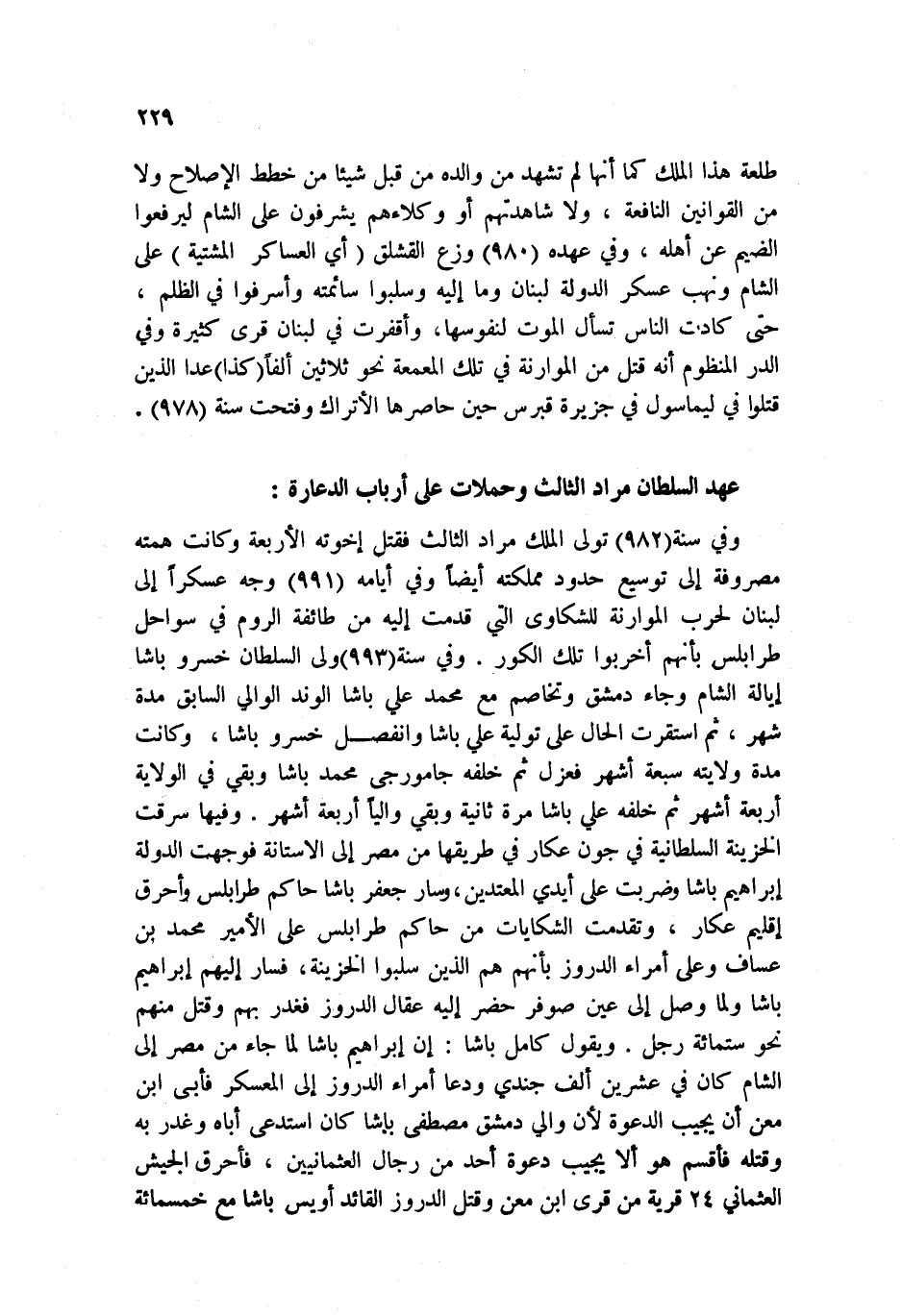 وفي سنة 982 تولى الملك مراد الثالث فقتل اخوته الأربعة وكانت همته مصروفة إلى توسيع حدود مملكته أيضاً وفي أيامه 991 وجه عسكراً إلى لبنان لحرب الموارنة للشكاوي التي قدمت إليه من طائفة الروم في سواحل طرابلس بأنهم أخربوا تلك الكور. وفي سنة 993 ولي السلطان خسرو باشا إيالة الشام وجاء دمشق وتخاصم مع محمد علي باشا الوند الوالي السابق مدة شهر، ثم استقرت الحال على تولية علي باشا وانفصل خسرو باشا، وكانت مدة ولايته سبعة أشهر فعزل ثم خلفه جامورجي محمد باشا وبقي في الولاية أربعة أشهر ثم خلفه علي باشا مرة ثانية وبقي والياً أربعة أشهر. وفيها سرقت الخزينة السلطانية في جون عكار في طريقها من مصر إلى الآستانة فوجهت الدولة إبراهيم باشا وضربت على أيدي المعتدين، وسار جعفر باشا حاكم طرابلس وأحرق إقليم عكار، وتقدمت الشكايات من حاكم طرابلس على الأمير محمد بن عساف وعلى أمراء الدروز بأنهم هم الذين سلبوا الخزينة، فسار إليهم إبراهيم باشا ولما وصل إلى عين صوفر حضر إليه عقال الدروز فغدر بهم وقتل منهم نحو ستمائة رجل. ويقول كامل باشا: إن إبراهيم باشا لما جاء من مصر إلى الشام كان في عشرين ألف جندي ودعا أمراء الدروز إلى المعسكر فأبى ابن معن أن يجيب الدعوة لأن والي دمشق مصطفى باشا كان استدعى أباه وغدر به وقتله فأقسم هو ألا يجيب دعوة أحد من رجال العثمانيين، فأحرق الجيش العثماني 24 قرية من قرى ابن معن وقتل الدروز القائد أويس باشا مع خمسمائة