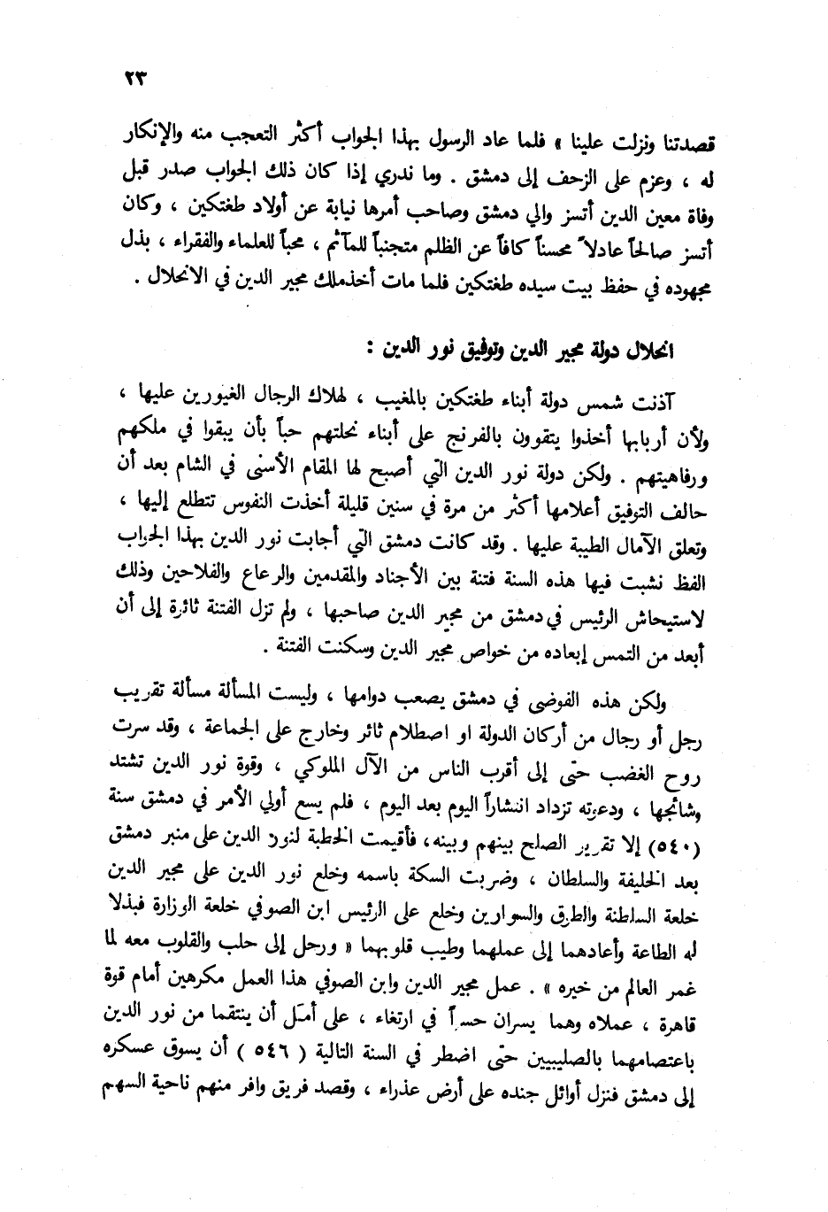 قصدتنا ونزلت علينا فلما عاد الرسول بهذا الجواب أكثر التعجب منه والإنكار له، وعزم على الزحف إلى دمشق. وما ندري إذا كان ذلك الجواب صدر قبل وفاة معين الدين أتسز والي دمشق وصاحب أمرها نيابة عن أولاد طغتكين، وكان أتسز صالحاً عادلاً محسناً كافاً عن الظلم متجنباً للمآثم، محباً للعلماء والفقراء، بذل مجهوده في حفظ بيت سيده طغتكين فلما مات أخذ ملك مجير الدين في الانحلال.