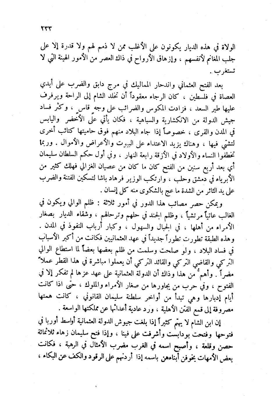 ويمكن حصر مصائب هذا الدور في أمور ثلاثة: ظلم الوالي ويكون في الغالب عاتياً مرتشياً، وظلم الجند في حلهم وترحالهم، وشقاء الديار بصغار الأمراء من أهلها، في الجبال والسهول، وكبار أرباب النفوذ في المدن. وهذه الطبقة تطورت تطوراً جديداً في عهد العثمانيين فكانت من أكبر الأسباب في فساد البلاد، ولو صلحت وسلمت من ظلم بعضها بعضاً لما استطاع الوالي التركي والقاضي التركي