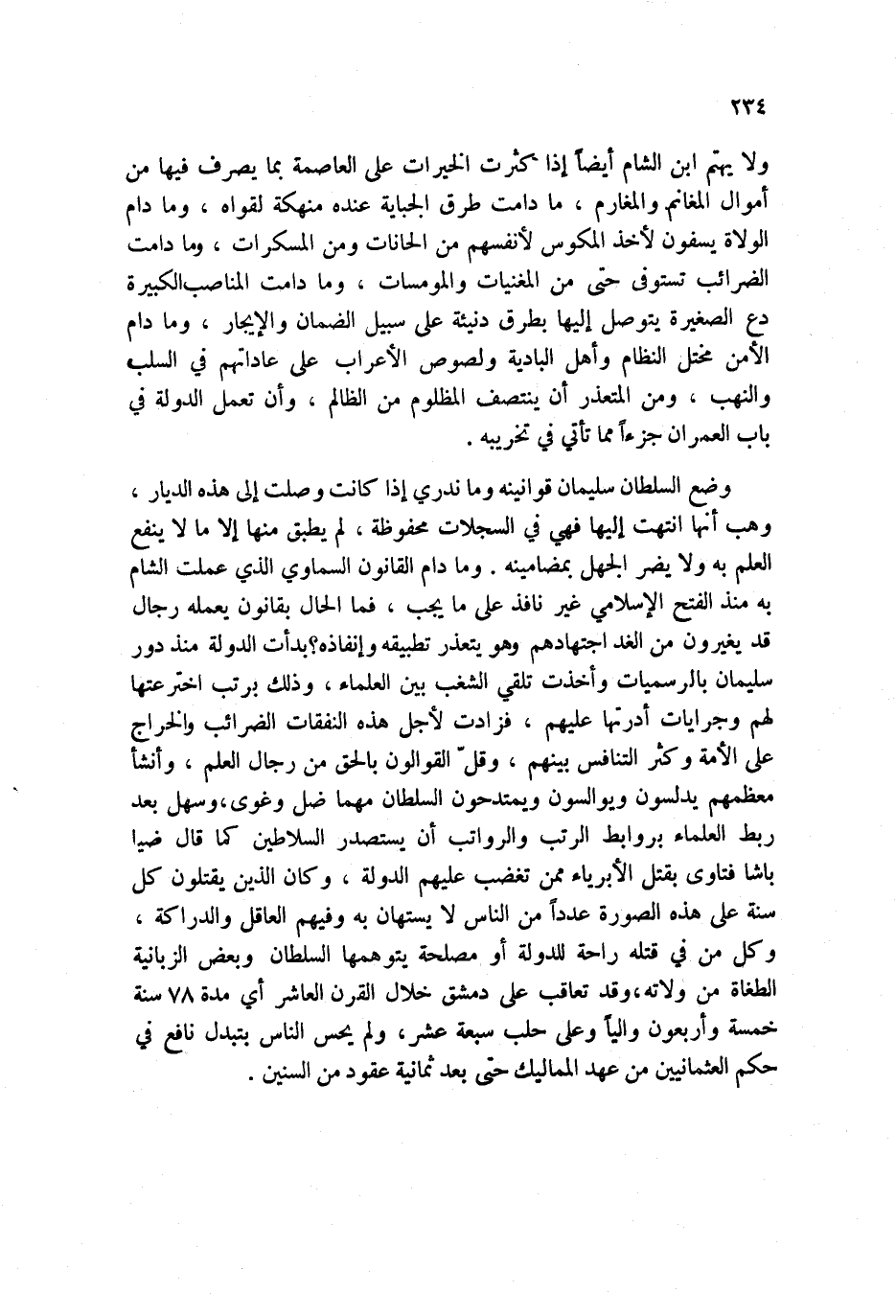 ولا يهتم ابن الشام أيضاً إذا كثرت الخيرات على العاصمة بما يصرف فيها من أموال المغانم والمغارم، ما دامت طرق الجباية عنده منهكة لقواه، وما دام الولاة يسفون لأخذ المكوس لأنفسهم من الحانات ومن المسكرات، وما دامت الضرائب تستوفي حتى من المغنيات والمومسات، وما دامت المناصب الكبيرة دع الصغيرة يتوصل إليها بطرق دنيئة على سبيل الضمان والإيجار، وما دام الأمن مختل النظام وأهل البادية ولصوص الأعراب على عاداتهم في السلب والنهب، ومن المتعذر أن ينتصف المظلوم من الظالم، وأن تعمل الدولة في باب العمران جزءاً مما تأتي في تخريبه.