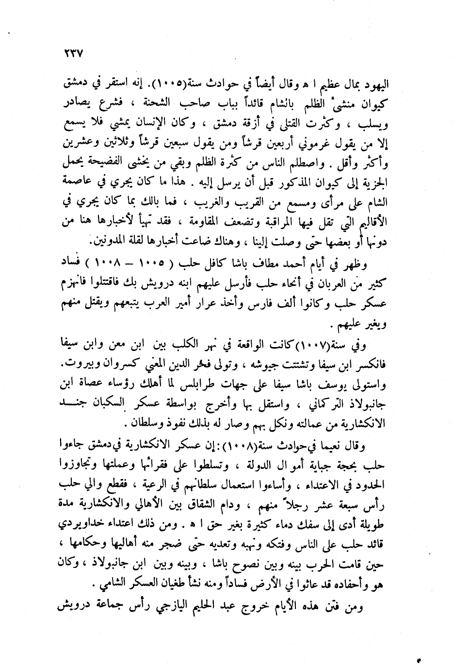 ونهبه وتعديه حتى ضجر منه أهاليها وحكامها، حين قامت الحرب بينه وبين نصوح باشا، وبينه وبين ابن جانبولاذ، وكان هو وأحفاده قد عاثوا في الأرض فساداً ومنه نشأ طغيان العسكر الشامي.